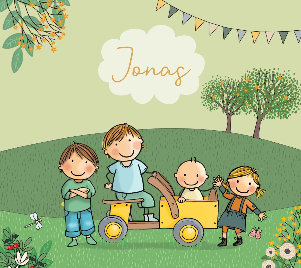 Geboortekaartje jongen met houten bakfiets en vier kinderen