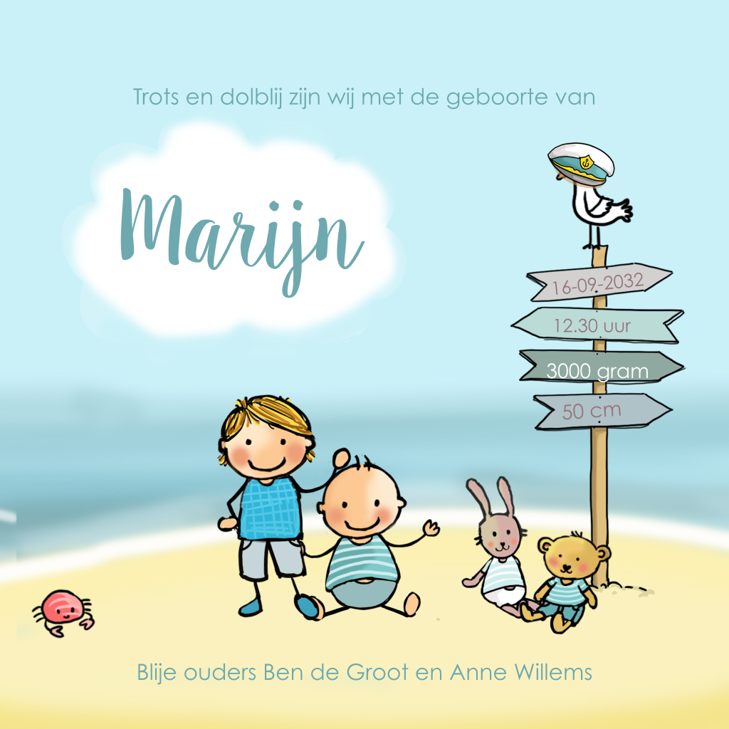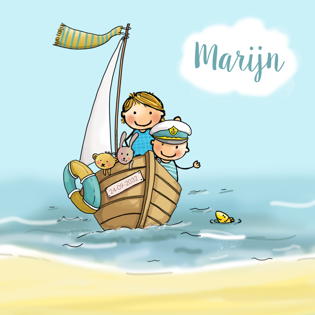 Geboortekaartje voor een jongen in een bootje met zijn grotere broer, mooi geïllustreerd kaartje van de zee met boot en vissen. De afbeeldingen zijn los, deze kun je verschuiven.