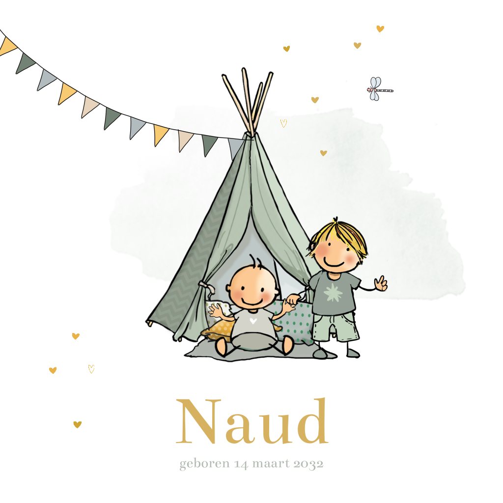 Geboortekaartje voor een tweede kindje met jongen en ouder broertje bij groene tipitent met vlaggetjes. Pas zelf dit leuke geboortekaartje aan en bestel een drukproef.