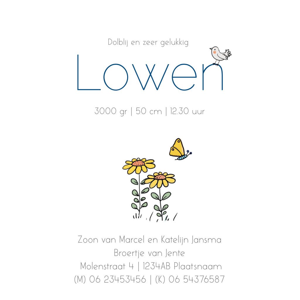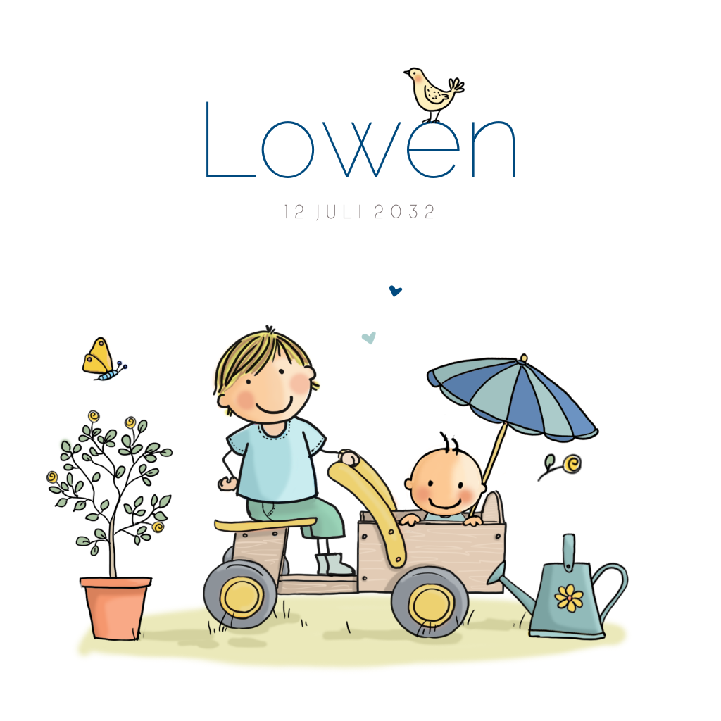 Als er een tweede kindje op komst is, hoe leuk is het dan om allebei de kindjes op het geboortekaartje af te beelden. Dit vrolijke geboortekaartje met baby jongen in kruiwagen met groter broertje, boompjes en gieter met bloemen is ideaal.