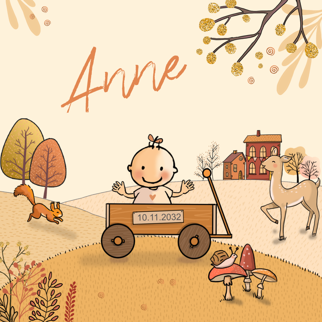 Prachtig geillustreerd geboortekaartje van een meisje in kar met herfst achtergrond. Lieve bosdieren zijn toegevoegd zoals een eekhoorn, ree, slak en egeltje.