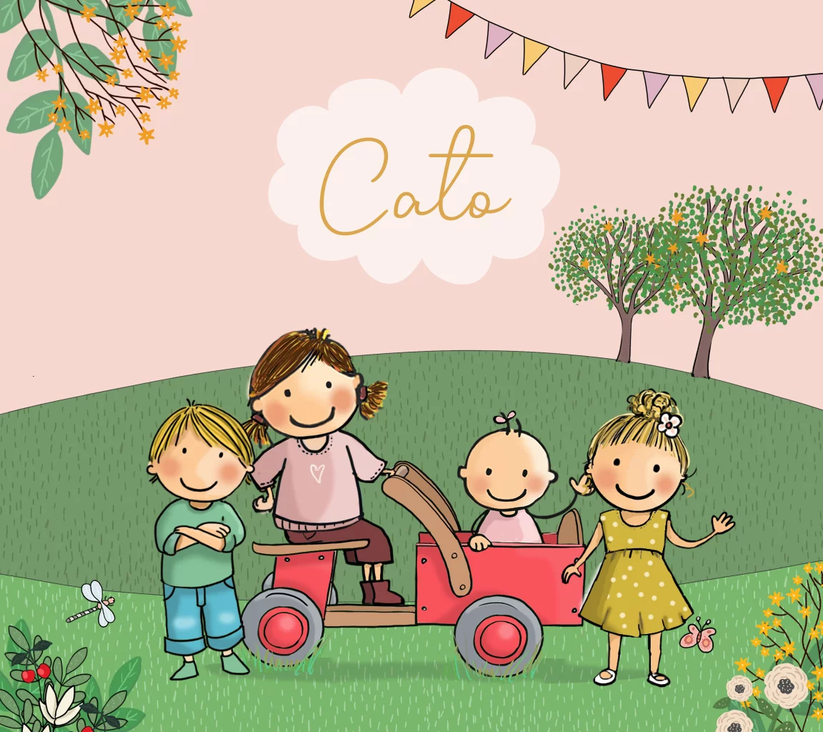 Vrolijk geboortekaartje met een houten bakfiets met alle vier de kindjes erop.