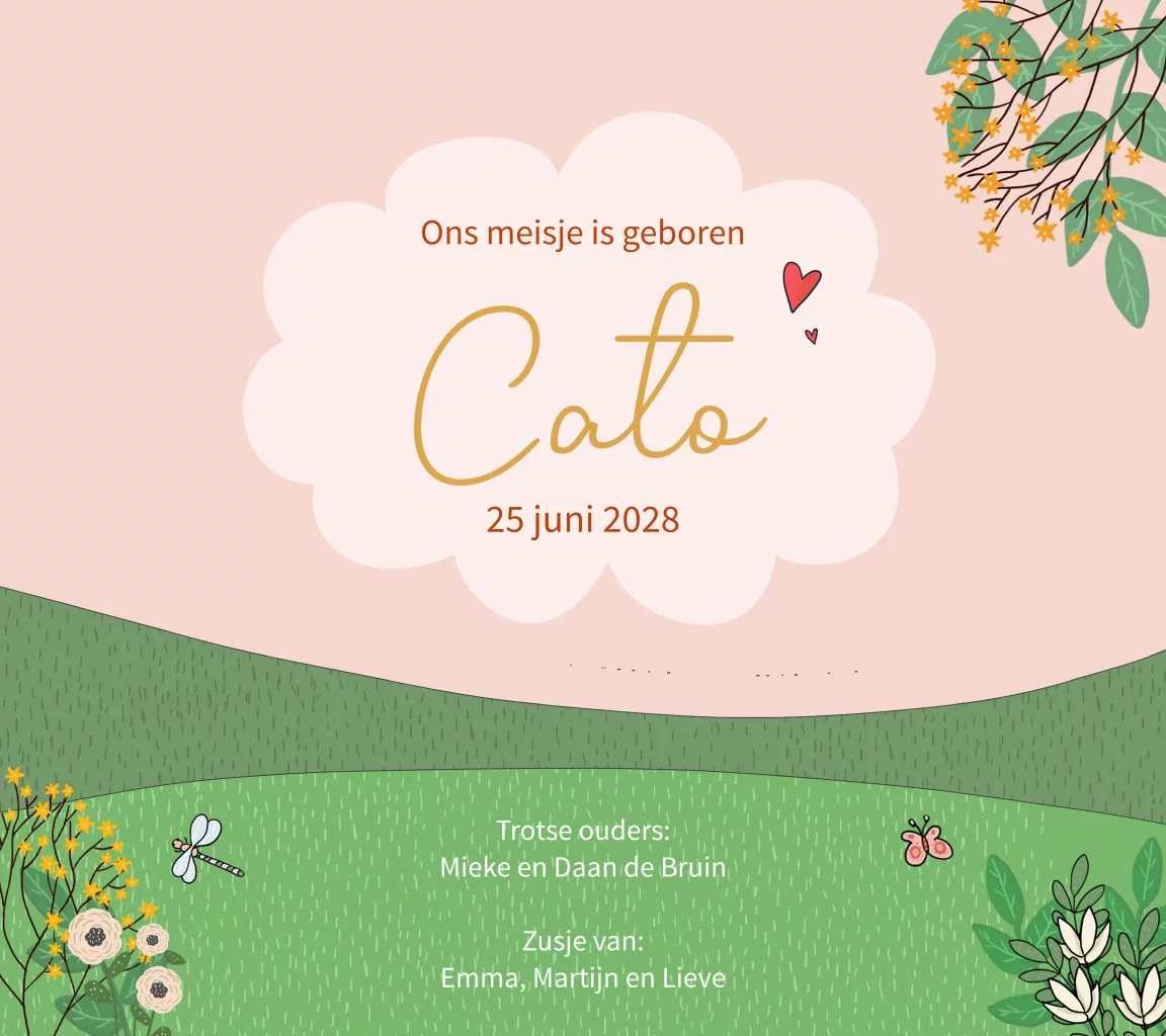 Geboortekaartje meisje met houten bakfiets en vier kinderen
