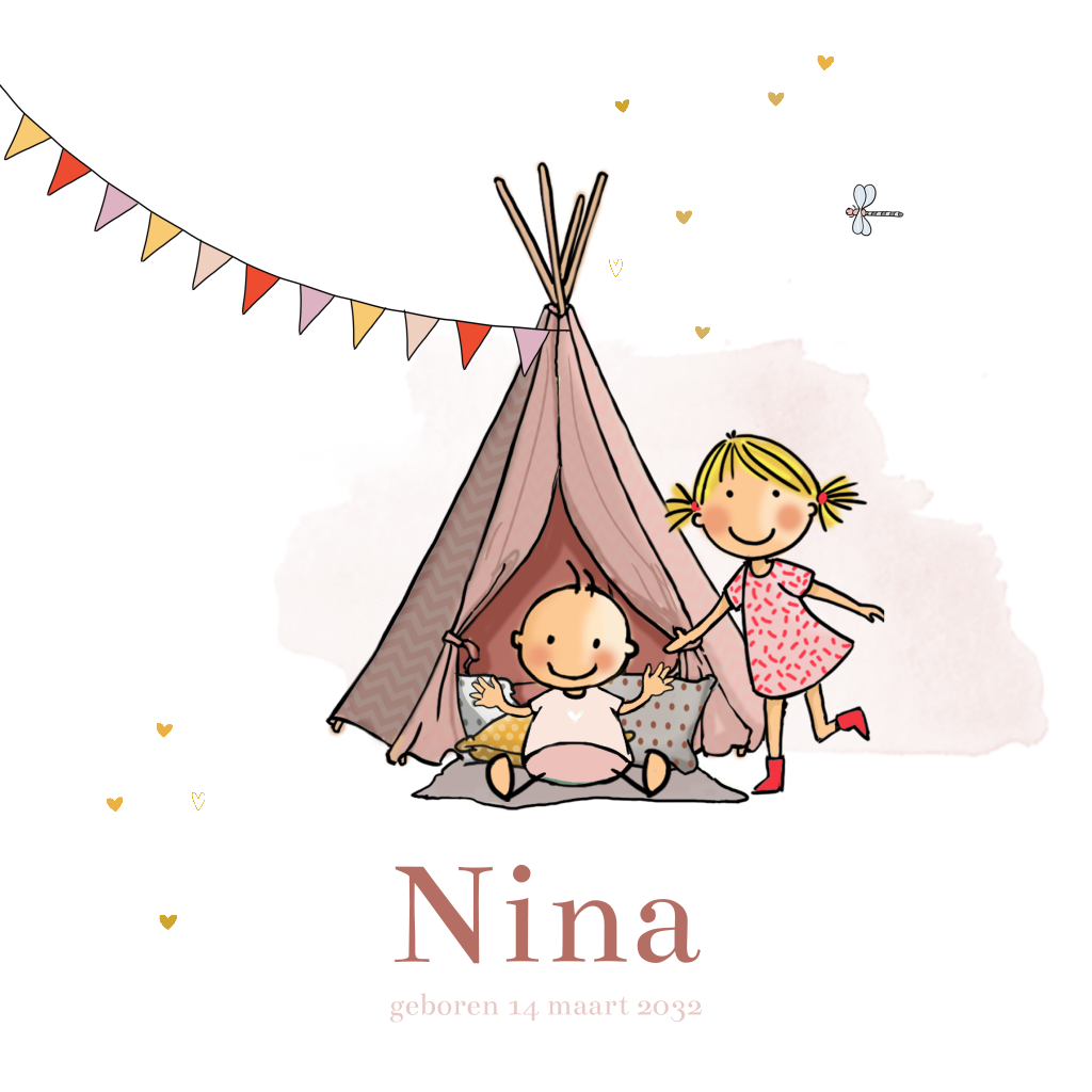 Ben je zwanger van een tweede kindje en weer een meisje? Kies dit leuke geboortekaartje met baby meisje en zusje bij roze tipitent met vlaggetjes en watercolor.