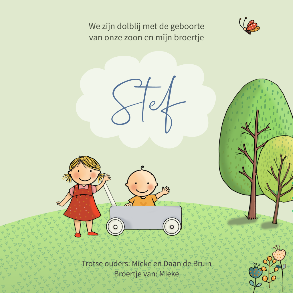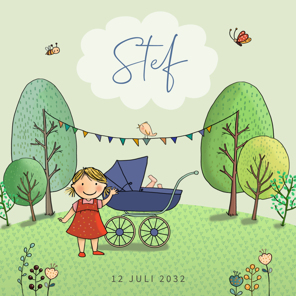 Geboortekaartje voor een tweede kind met grote zus met blauwe kinderwagen waar haar baby broertje in ligt in fris groen landschap met bomen, bloemen en vlaggetjes.