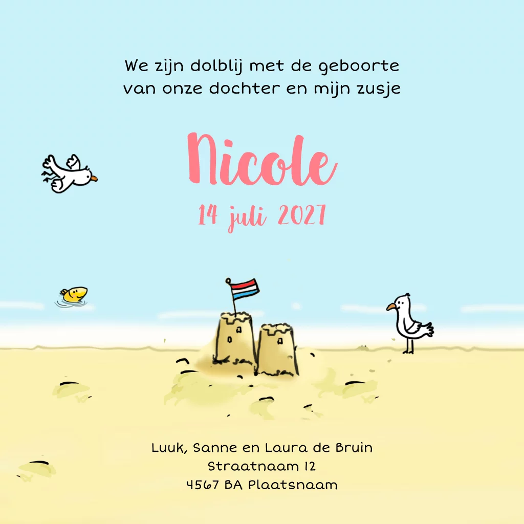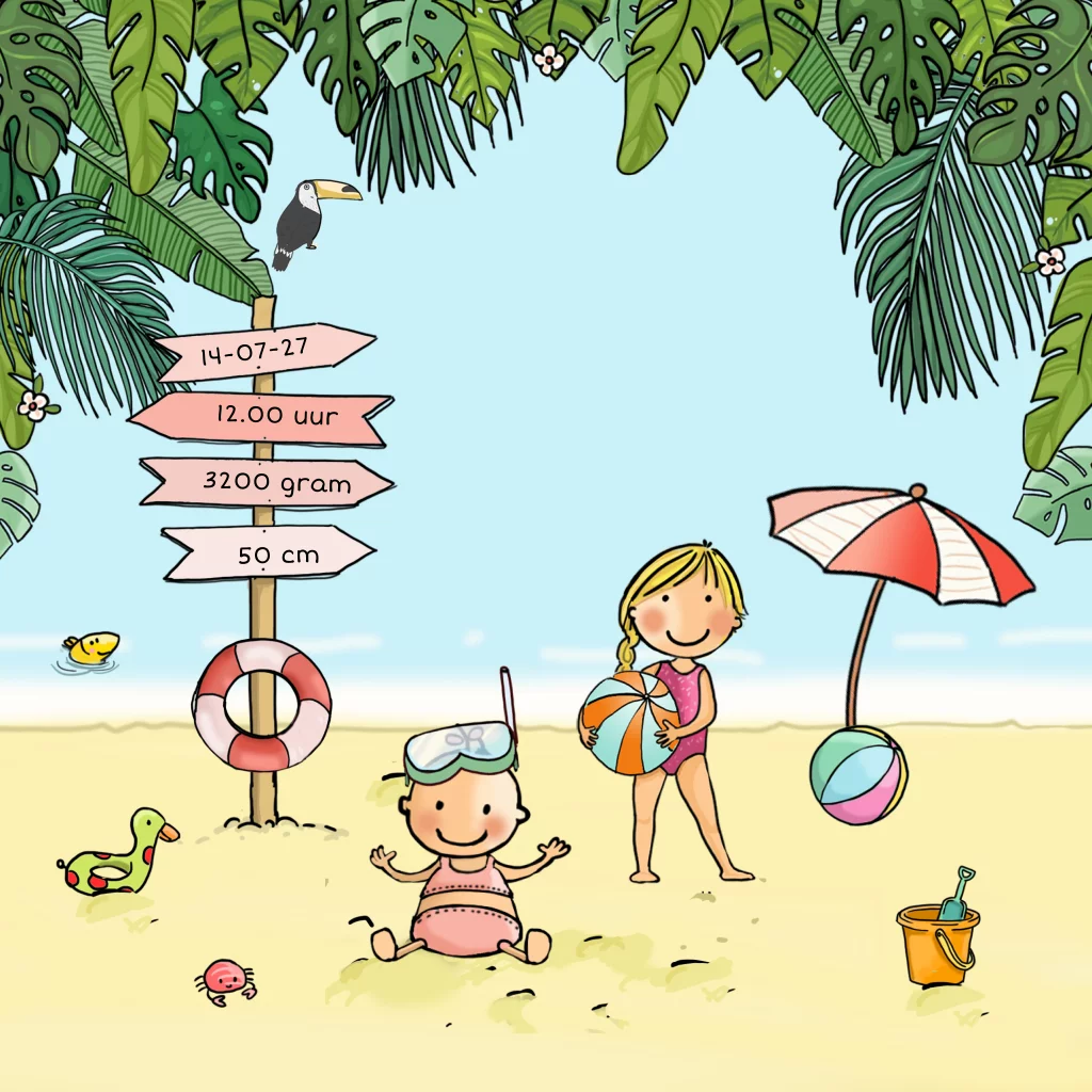 Ben je in verwachting van een 2e kindje, dochter en verwacht je haar deze zomer? Kies dan voor een geboortekaartje met zon, zee en strand. Op dit geboortekaartje zit het baby meisje op het strand in het zand. Haar grote zus staat met een strandbal in haar handen. Op het pijlenbord staan de geboortegegevens. Pas zelf dit leuke meisjes geboortekaartje aan.