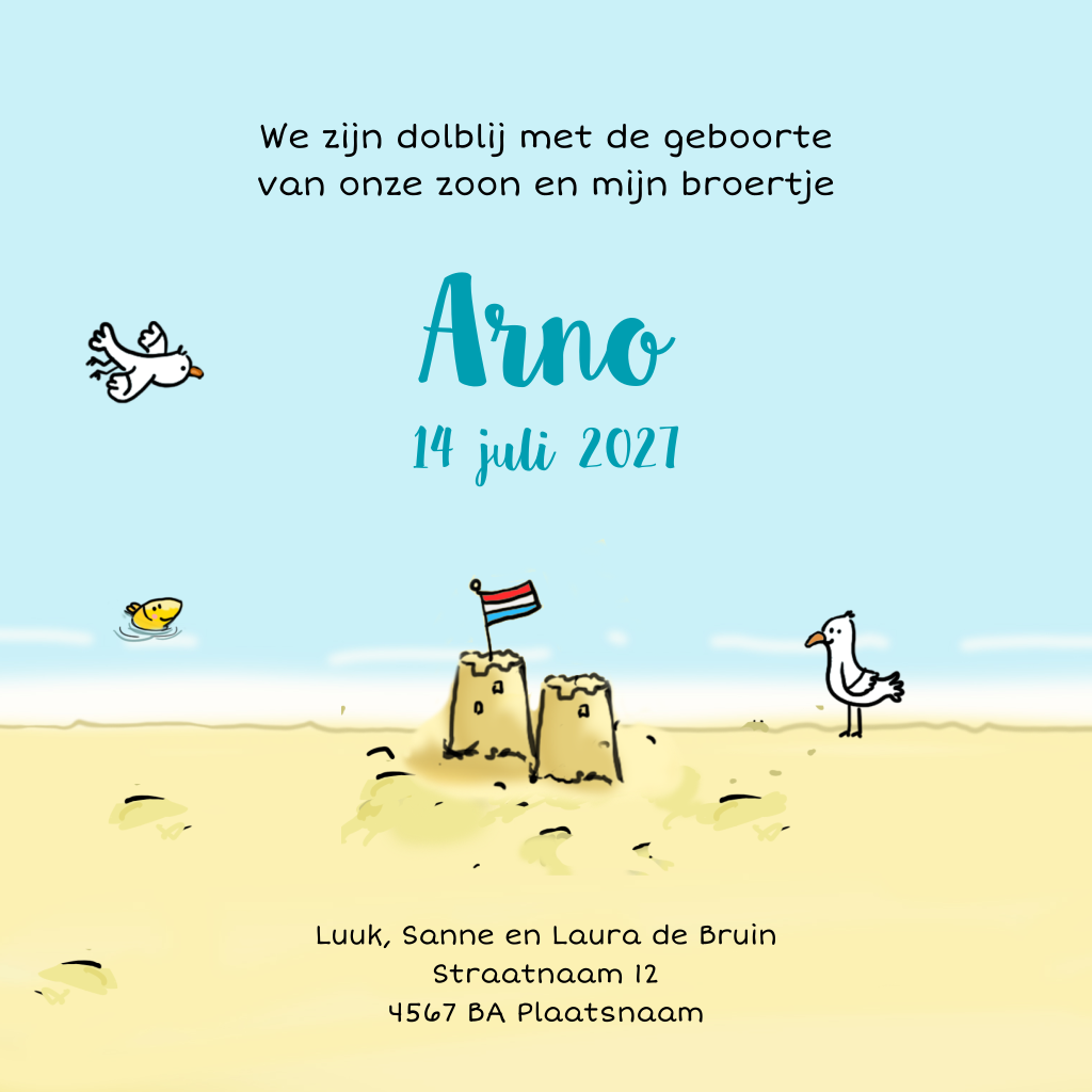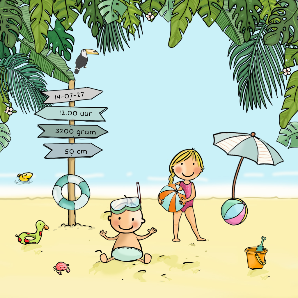 Ben je in verwachting van een 2e kindje, een zoontje en verwacht je hem deze zomer? Kies dan voor een geboortekaartje met zon, zee en strand. Op dit geboortekaartje zit het baby jongetje op het strand in het zand. Zijn grote brzuser staat met een gekleurde strandbal. Op het pijlenbord staan de geboortegegevens. Pas zelf dit leuke jongens geboortekaartje aan.