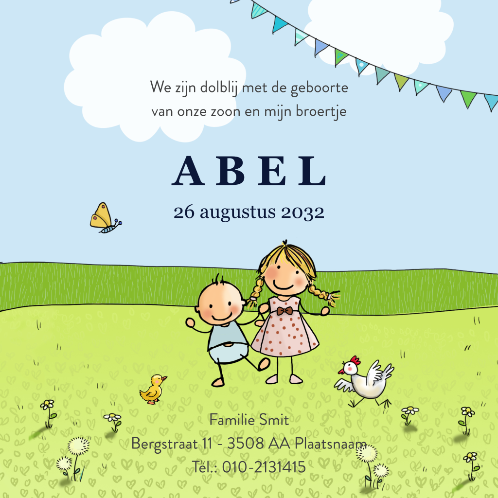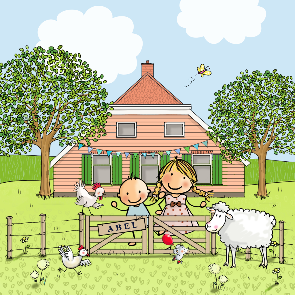 Superleuk geboortekaartje waar zowel de oudste zus als haar baby broertje op staan. De twee kinderen staan bij hekje voor de boerderij met schaap en kippen. Toepasselijk hollands geboortekaartje.