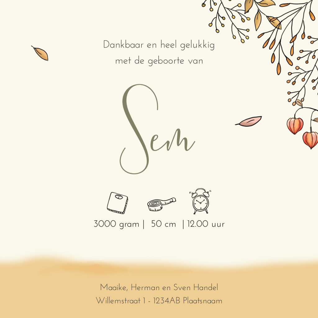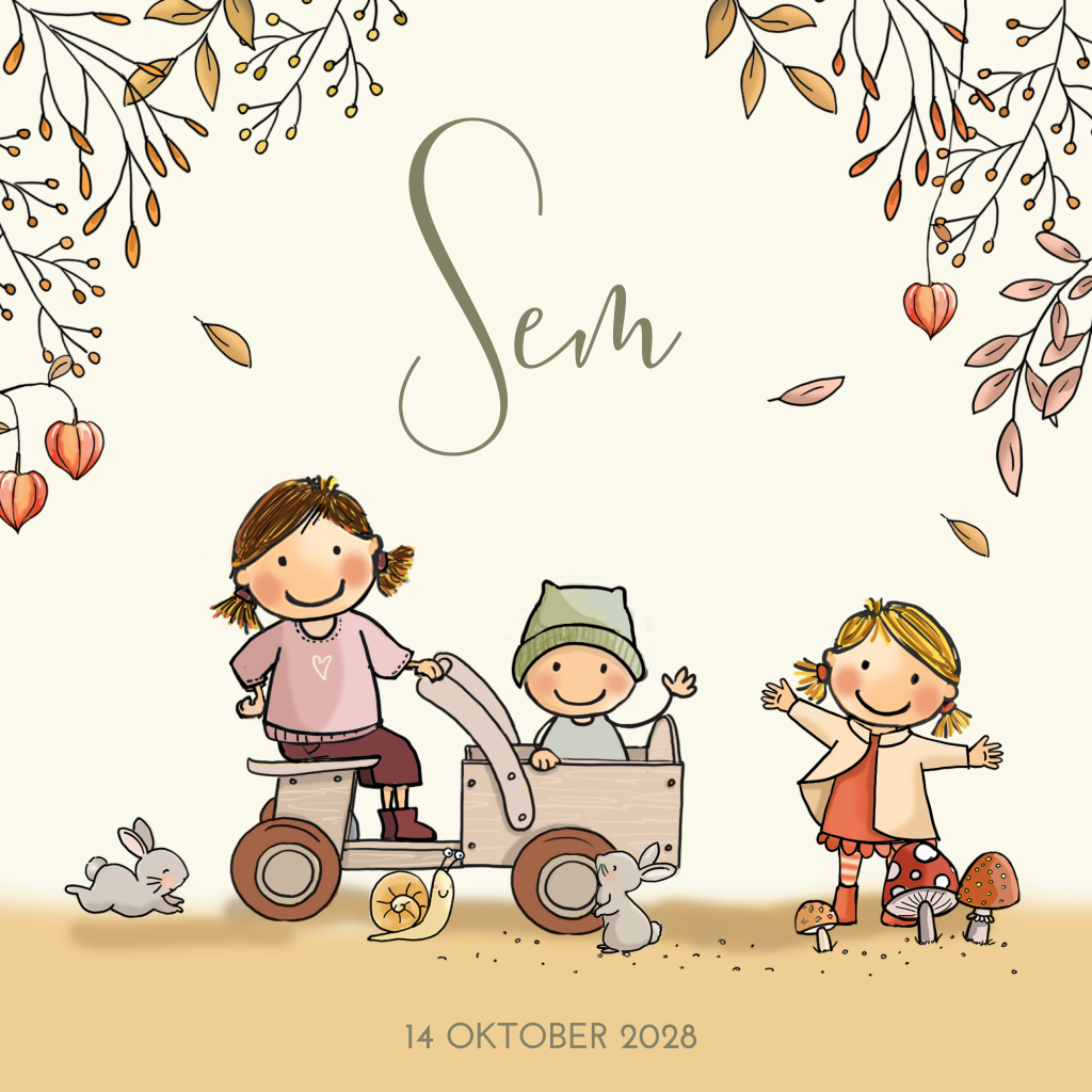 Hoera, er is een derde kindje op komst! Gefeliciteerd. Ben je uitgerekend in de herfst dan is dit geboortekaartje perfect voor jullie gezin. Alledrie de kinderen spelen een rol op dit herfst geboortekaartje.