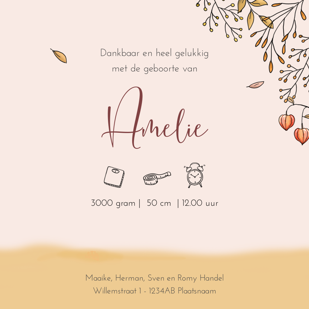 Hoera, er is een derde kindje op komst! Hoe leuk is dat. Ben je uitgerekend in het najaar dan is dit geboortekaartje ideaal voor jullie gezin. Alledrie de kinderen spelen een rol op dit herfst geboortekaartje.