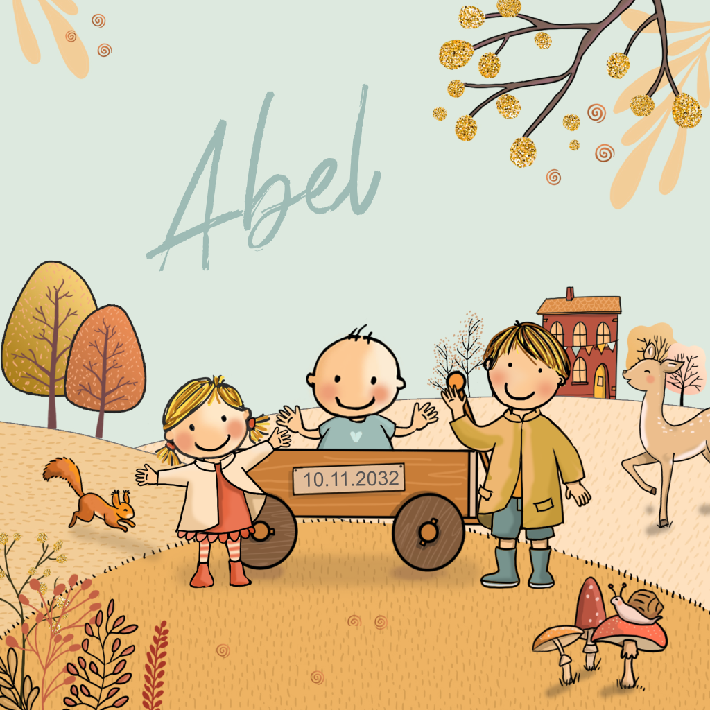 Herfst geboortekaartje om de geboorte van een 3e kindje aan te kondigen. Geboortekaartje met de twee oudste kinderen bij een kar met daarin hun baby broertje. Op de achtergrond mooie herfstbladeren en herfstkleuren.