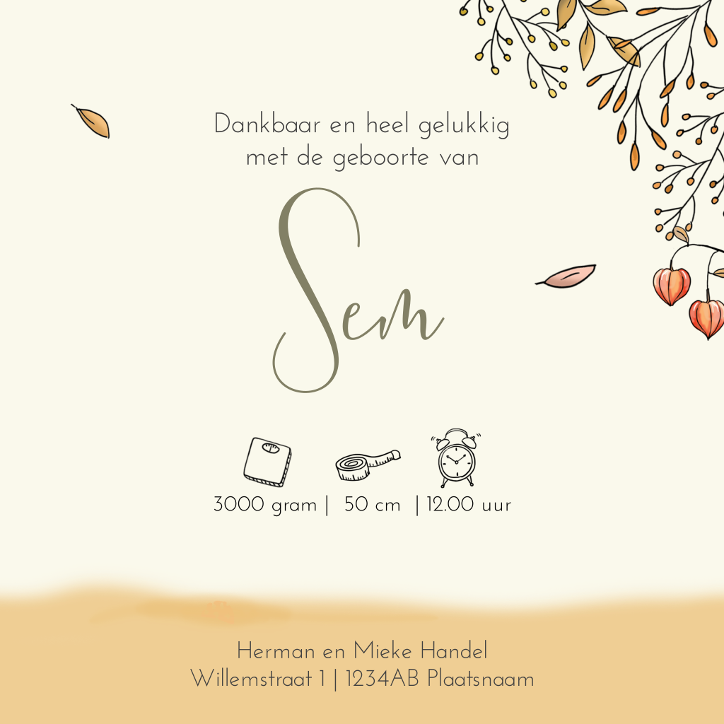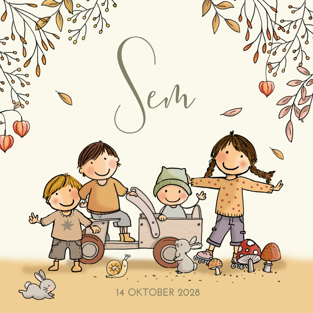 Hoera, er is een vierde kindje op komst! Hoe bijzonder is dat. Ben je uitgerekend in het najaar dan is dit geboortekaartje ideaal voor jullie gezin. Alle vier de kinderen spelen een rol op dit geboortekaartje. De oudste zoon zit op de houten kar met daarin zijn pasgeboren broertje. Zijn oudere zus en jonger broertje staan er blij naast. De kaart is opgemaakt in mooie herfstkleuren en je kunt alle teksten naar wens aanpassen.