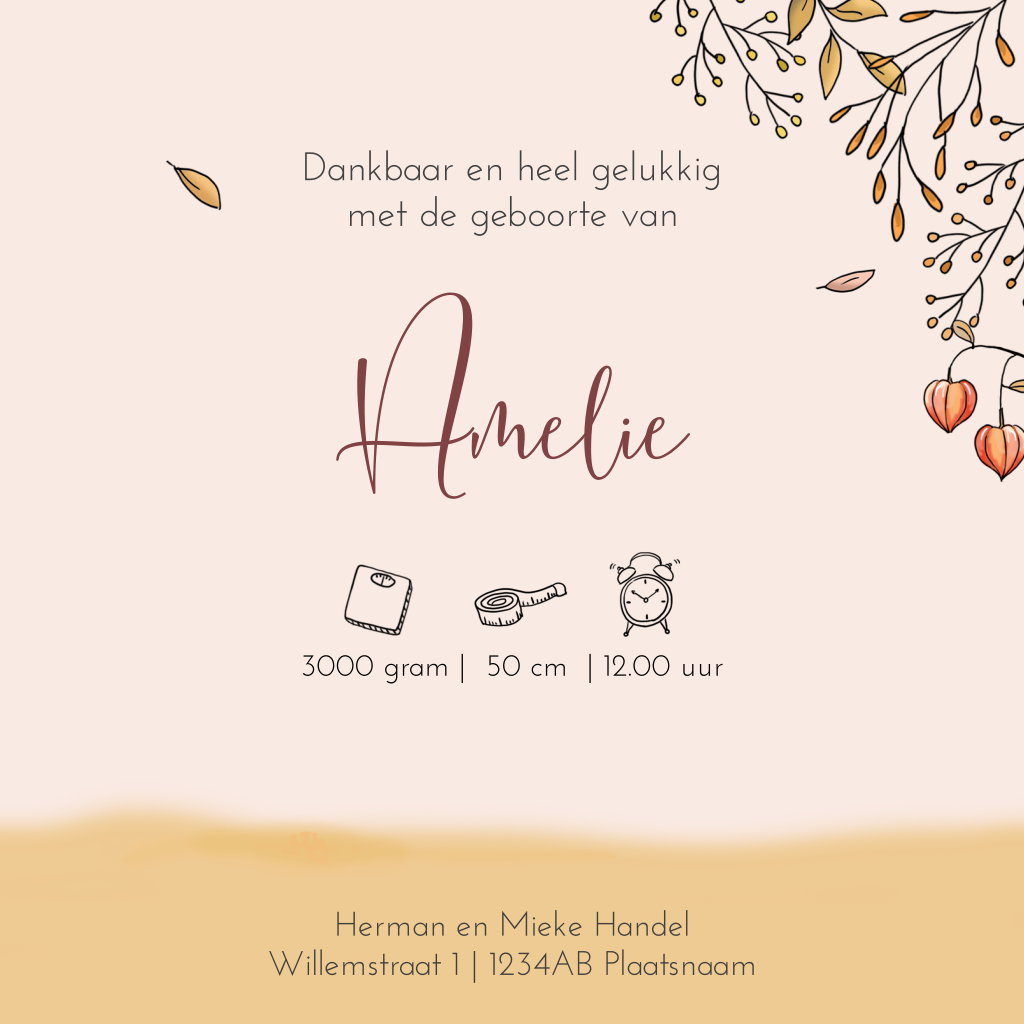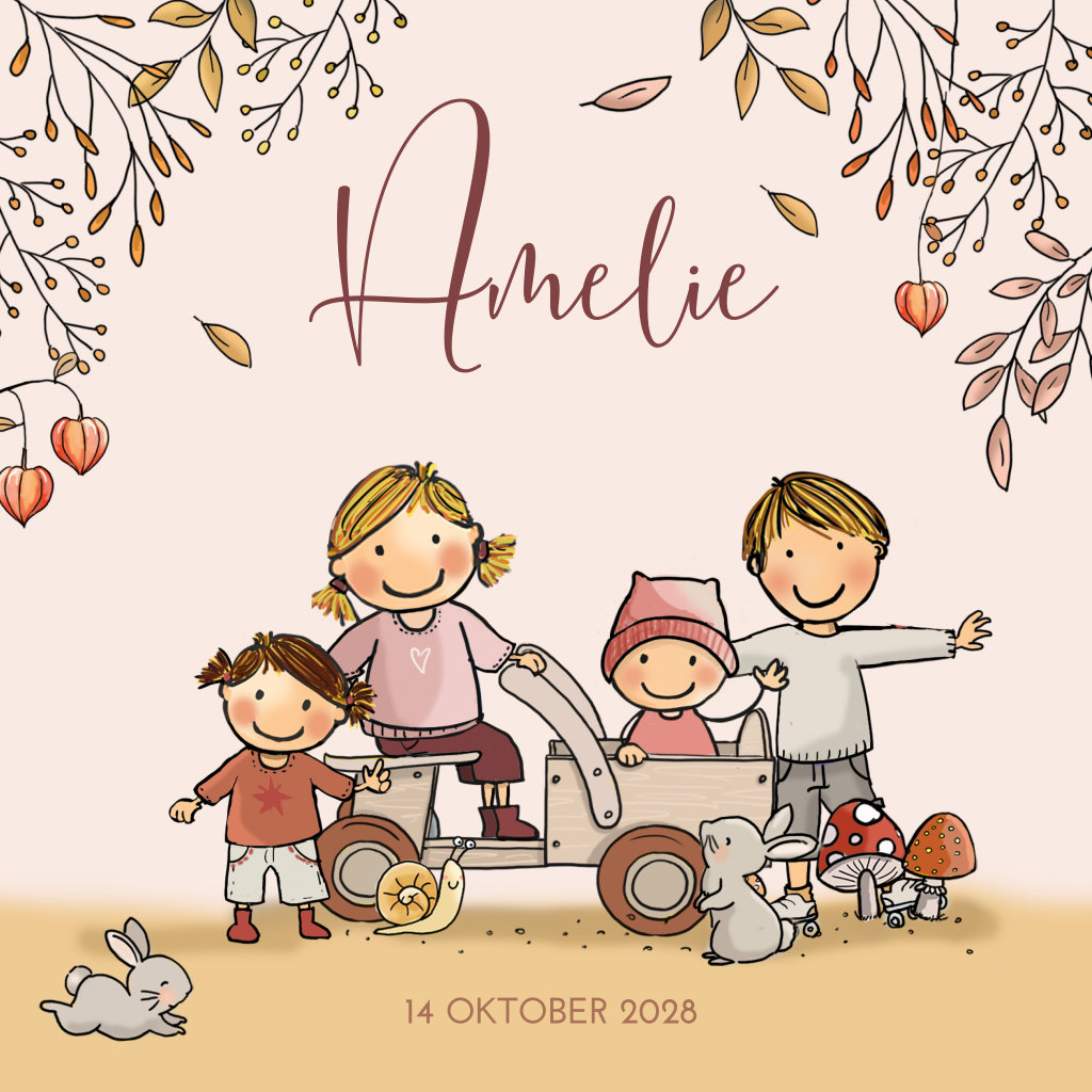 Hoera, er is een vierde kindje op komst! Hoe uniek is dat. Ben je uitgerekend in de herfst dan is dit geboortekaartje ideaal voor jullie gezin. Alle vier de kinderen spelen een rol op dit herfst geboortekaartje. De oudste dochter zit op een houten kar met daarin haar pasgeboren zusje. Haar oudere broer en kleinste zusje staan er blij naast. De kaart is opgemaakt in mooie herfstkleuren en je kunt alle teksten naar wens aanpassen.