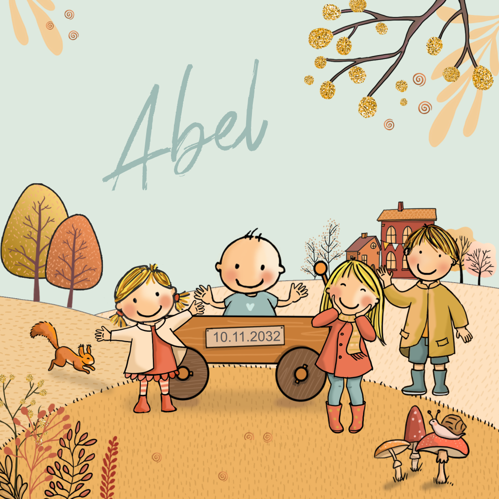 Herfst geboortekaartje om de geboorte van een 4e kindje aan te kondigen. Geboortekaartje met de drie oudste kinderen bij een kar met daarin hun baby broertje. Op de achtergrond mooie herfstbladeren en herfstkleuren.