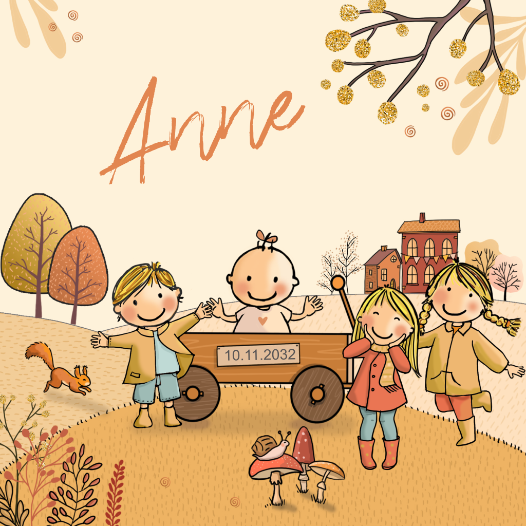 Herfst geboortekaartje voor als er een vierde kindje wordt geboren. Geboortekaartje met de drie oudste kinderen bij een kar met daarin hun baby zusje. Op de achtergrond mooie herfstbladeren en herfstkleuren.