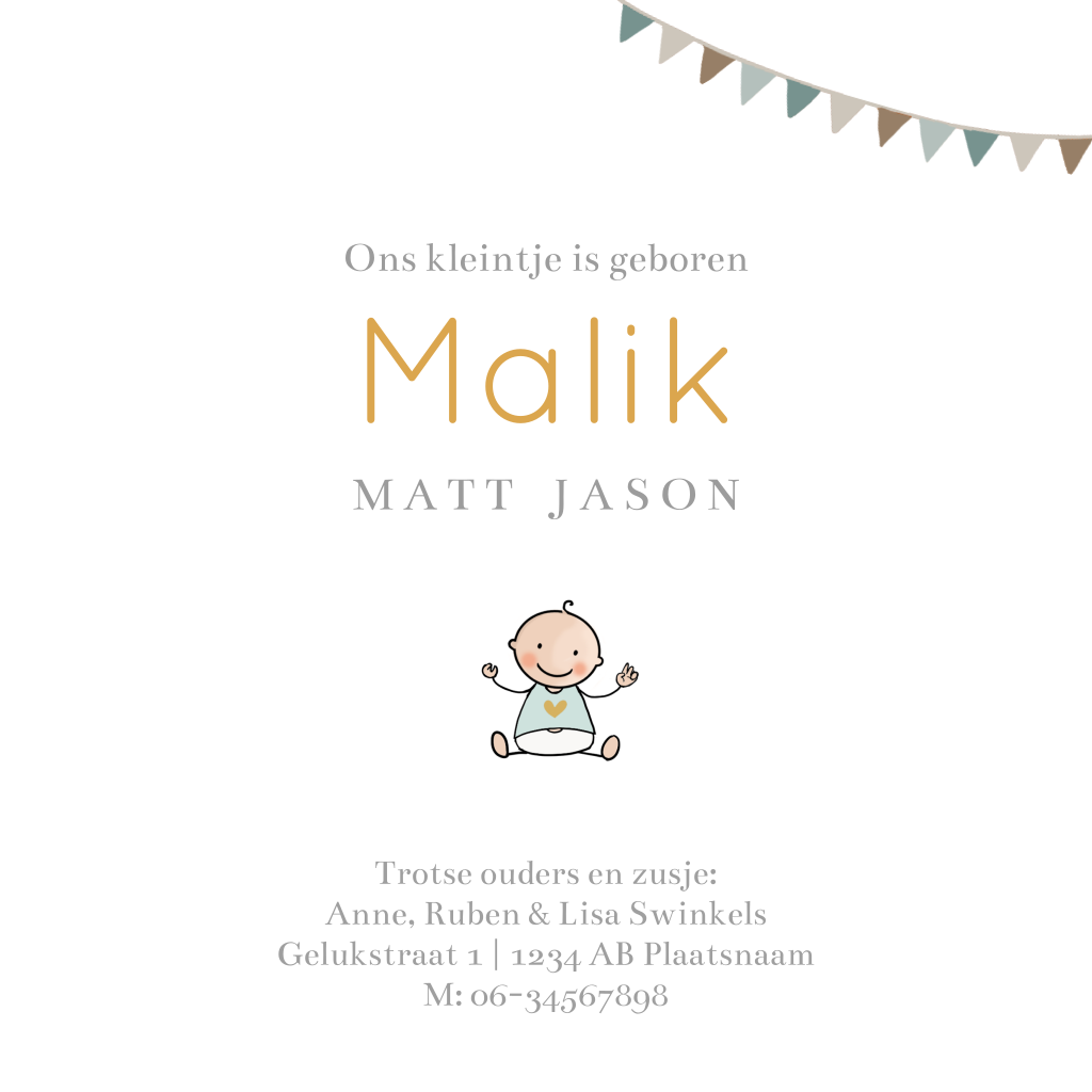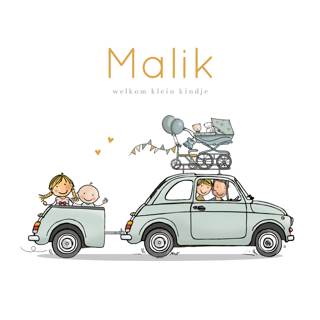 Geboortekaartje voor de geboorte van een baby jongen met Fiat 500 met aanhangwagen. Dit geboortekaartje is speciaal voor als er een tweede kindje op komst is en jullie al een dochter hebben. Voorin de Fiat zitten papa en mama en in de aanhangwagen de grote zus en haar broertje.