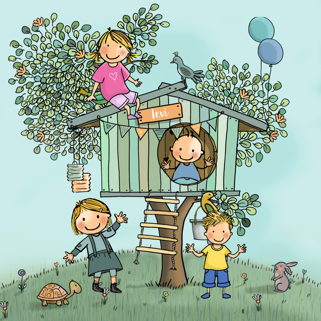 Jongens geboortekaartje met vier kindjes bij boomhut