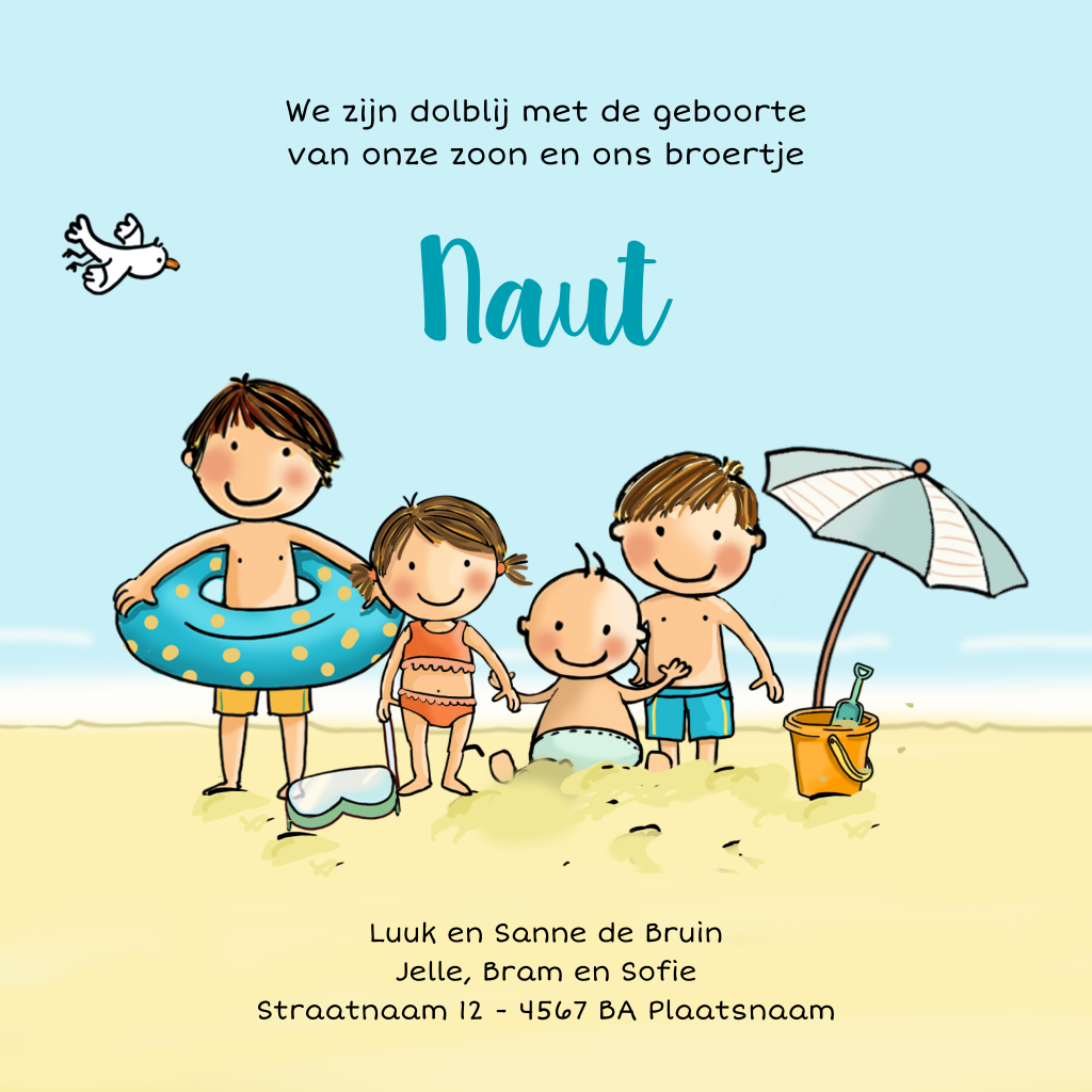 Ben je zwanger van een 4e kindje, dit keer een zoontje en verwacht je hem deze zomer? Kies dan voor een toepasselijk geboortekaartje met zomer en strand. De kinderen kun je eenvoudig zelf aanpassen naar je eigen gezinssamenstelling.
