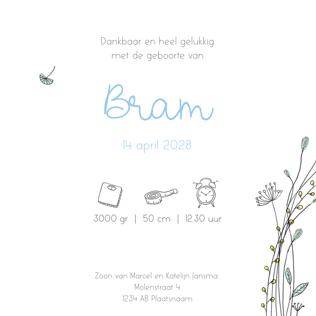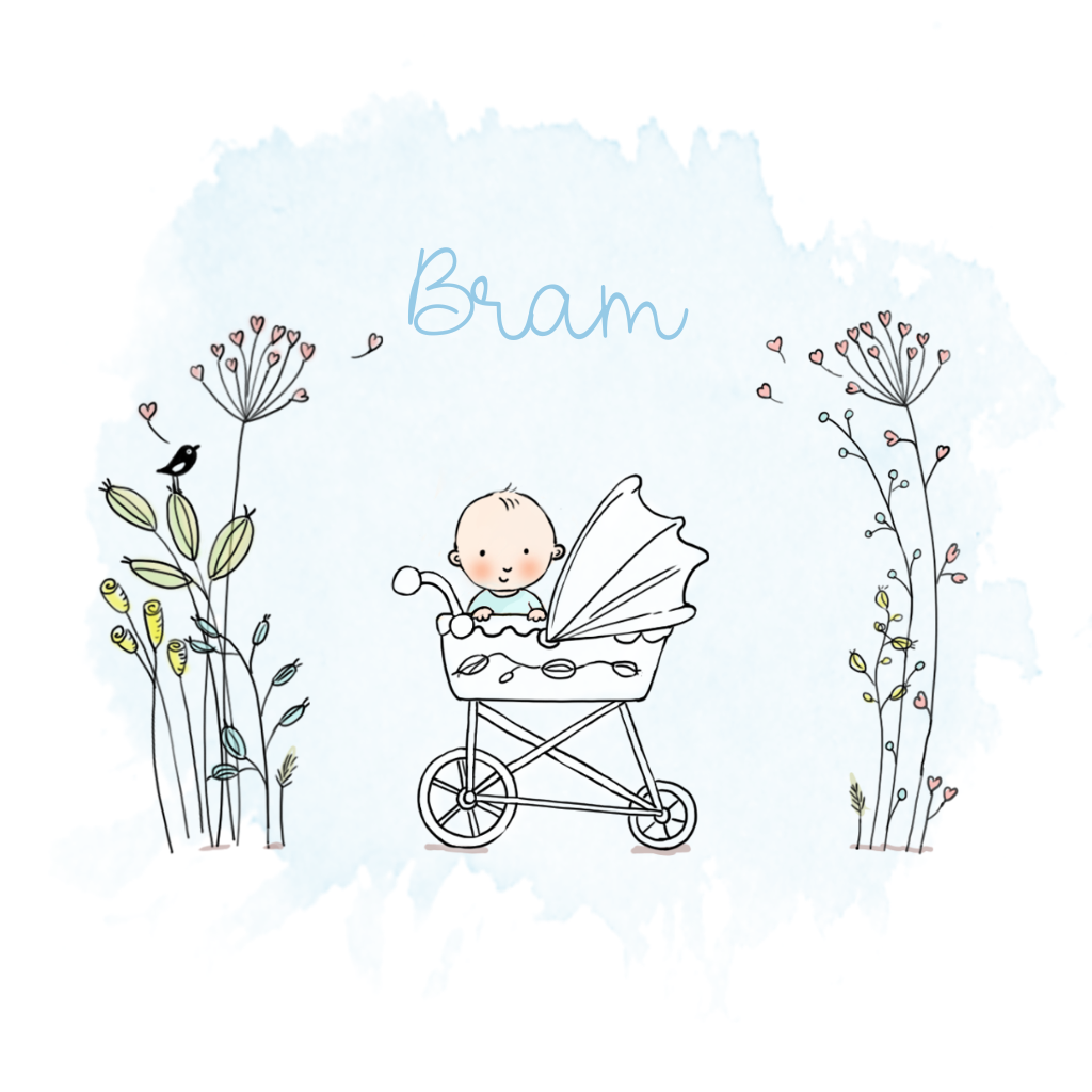 Super lief geboortekaartje met baby jongen in kinderwagen omringd met prachtige bloemen. Een bijna zwart wit illustratie met minimale tinten.