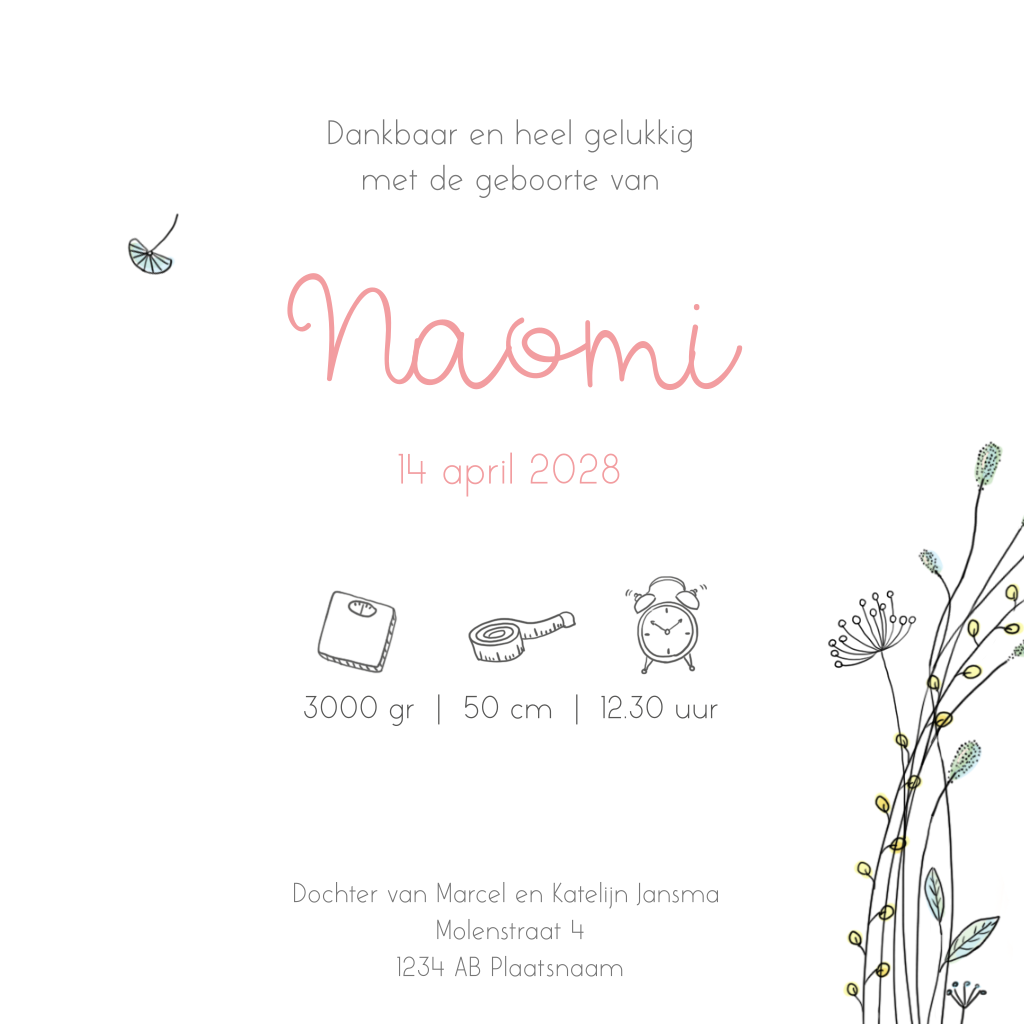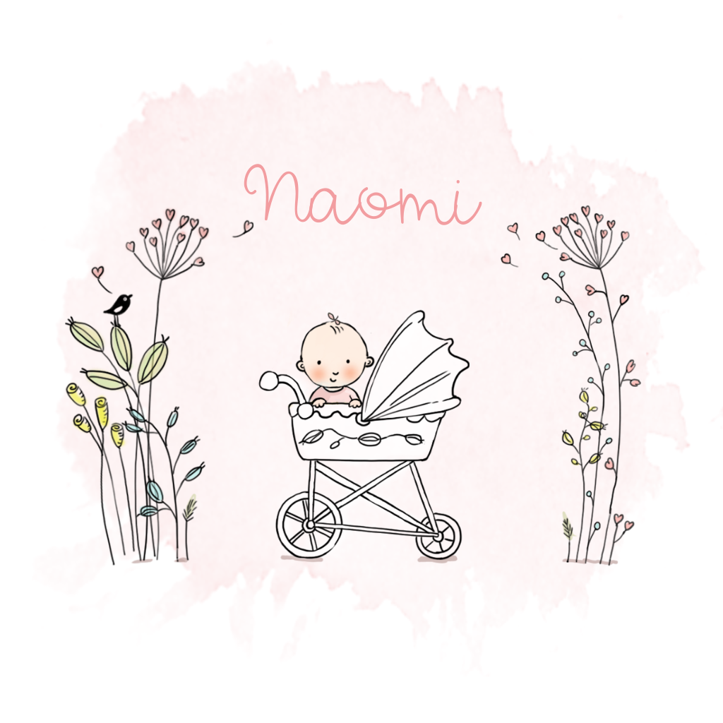 Super lief geboortekaartje met baby meisje in kinderwagen omringd met prachtige bloemen. Een bijna zwart wit illustratie met minimale tinten.