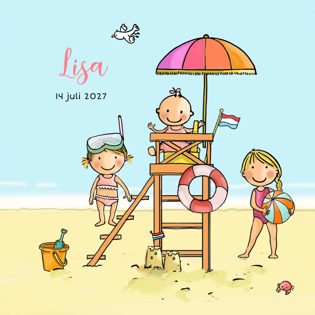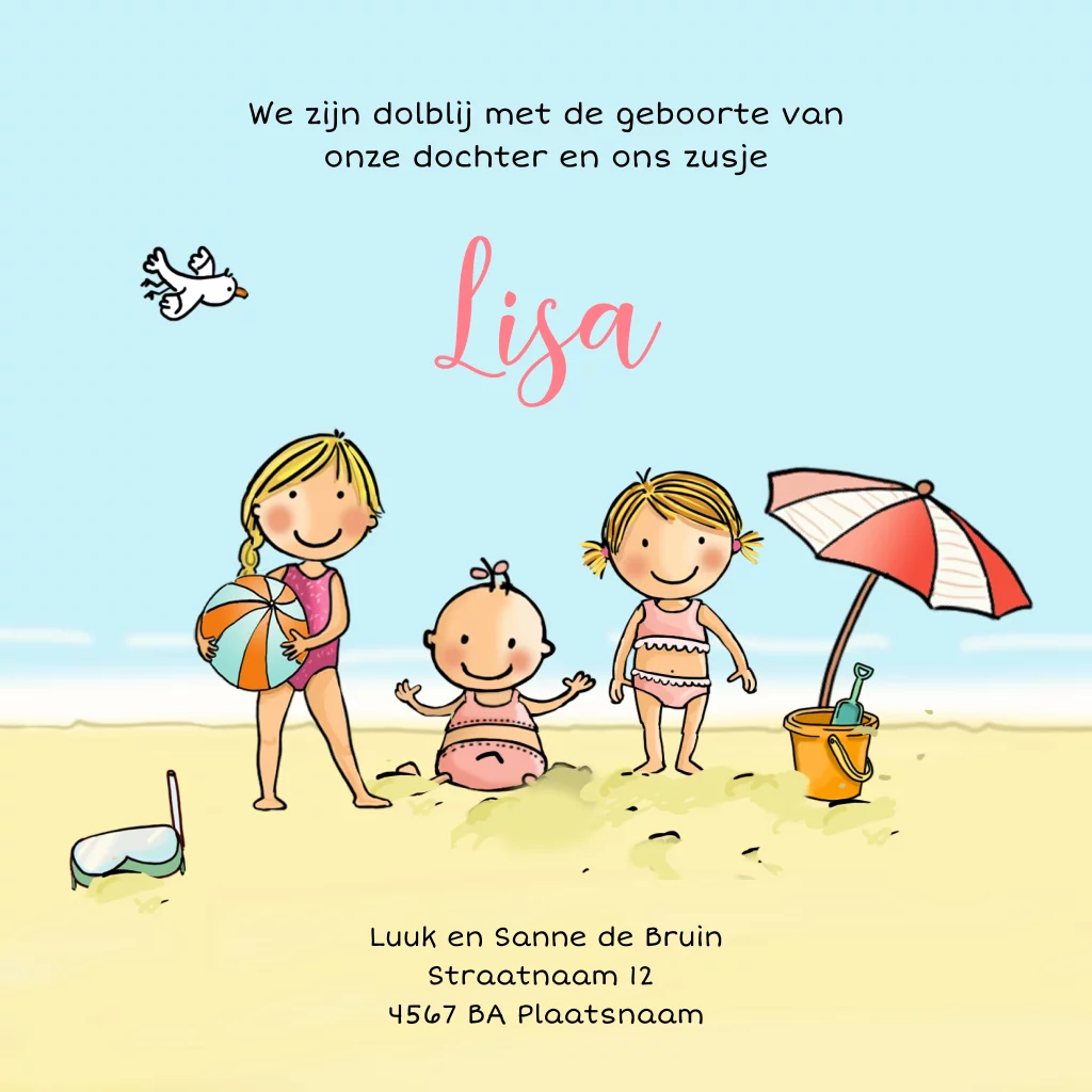 Ben je zwanger van een derde kindje en deze zomer uitgerekend? Kies dan voor een toepasselijk geboortekaartje met zomer, zee en strand. Zomerse geboortekaartje met de twee oudere kinderen met hun baby zusje op het strand. Je kunt de broertjes / zusjes vervangen door de gezinssamenstelling die bij jouw past.