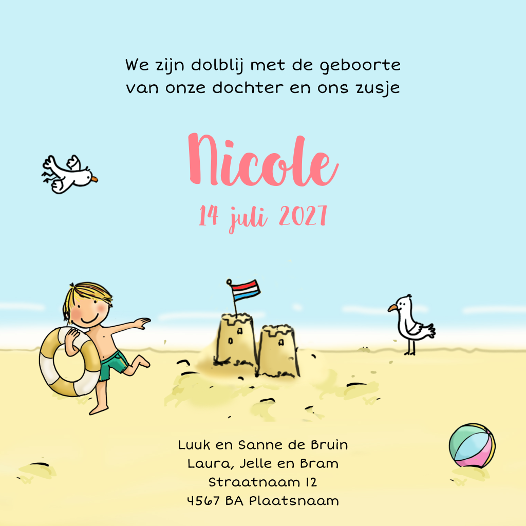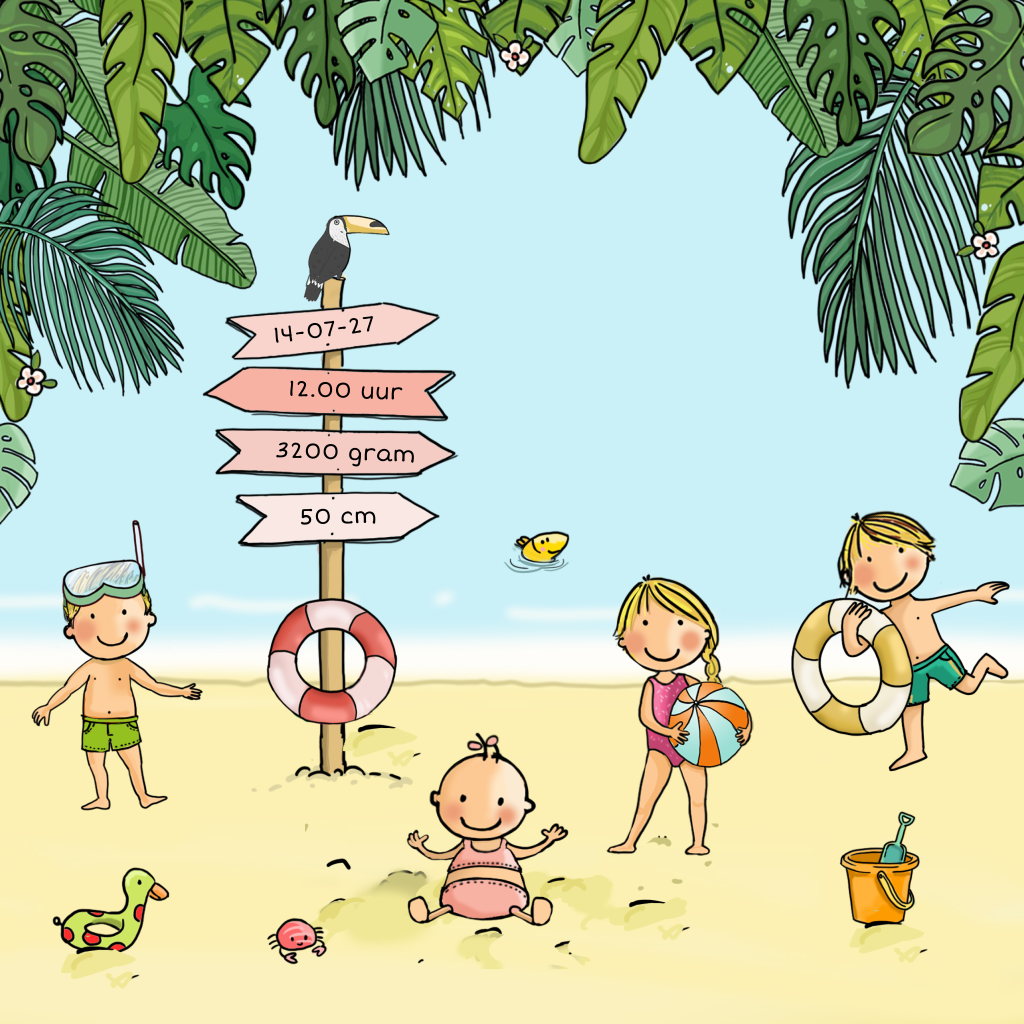Ben je in verwachting van een 4e kindje en deze zomer uitgerekend? Dan is een strand geboortekaartje natuurlijk erg toepasselijk. De volgorde van de kinderen kun je eenvoudig wijzigen. De broertjes / zusjes kun je terug vinden bij de afbeeldingen en zelf vervangen. Heb je hulp nodig? Dan horen we het graag.