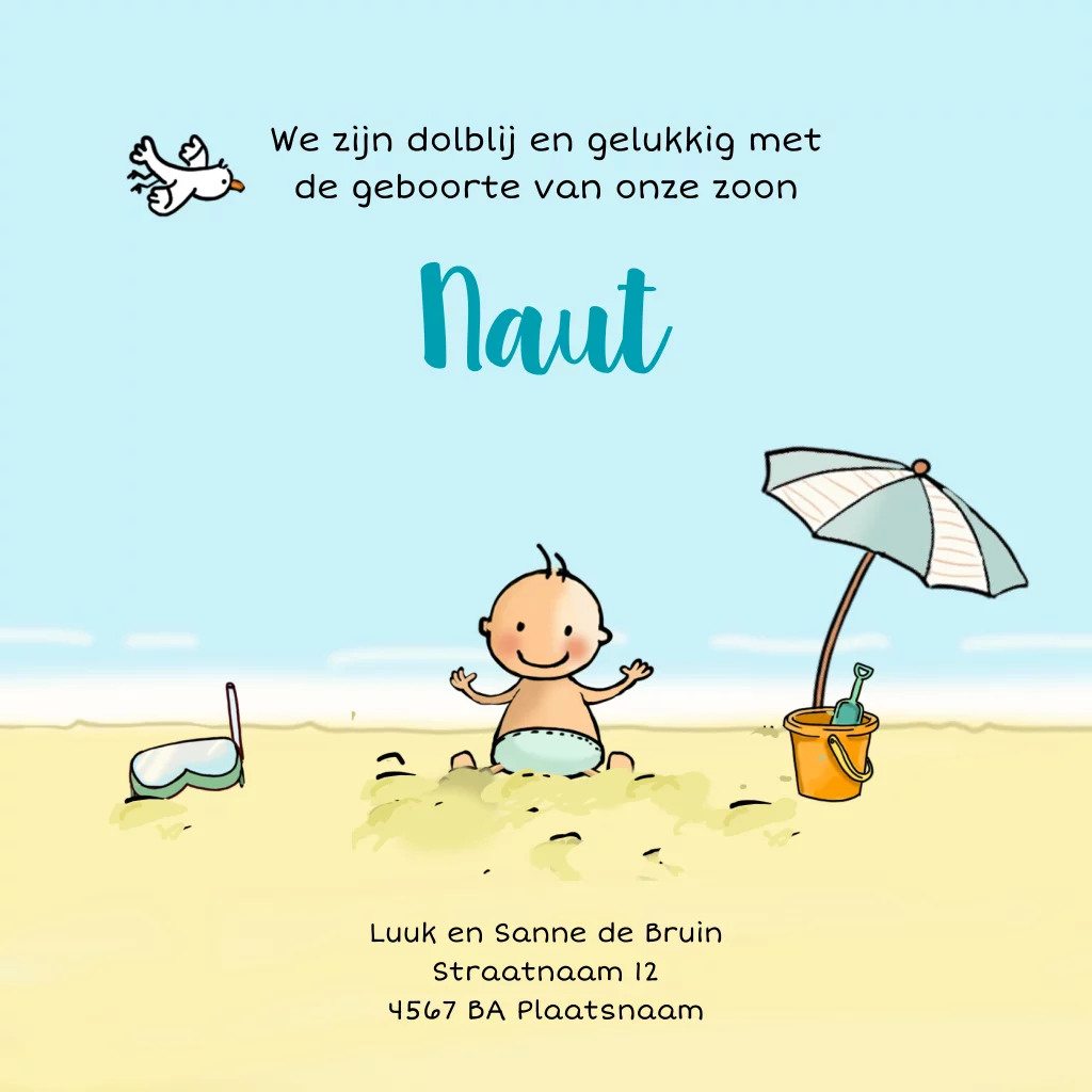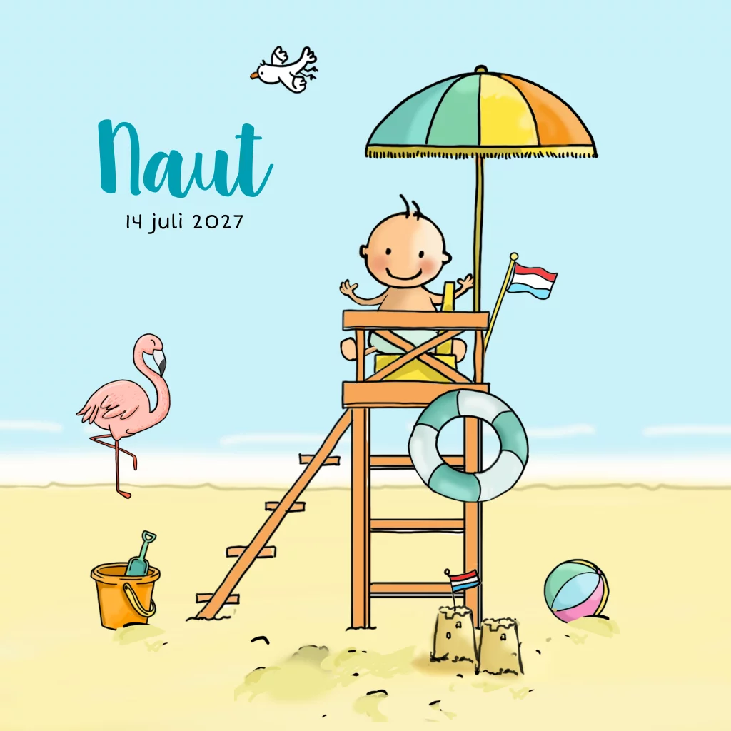 Ben je in verwachting van een zoontje en wordt hij deze zomer geboren? Kies dan dit lieve zomerse geboortekaartje met baby jongen op een uitkijkstoel op het strand uitkijkend over zee. In het zand liggen een emmer en schepje.
