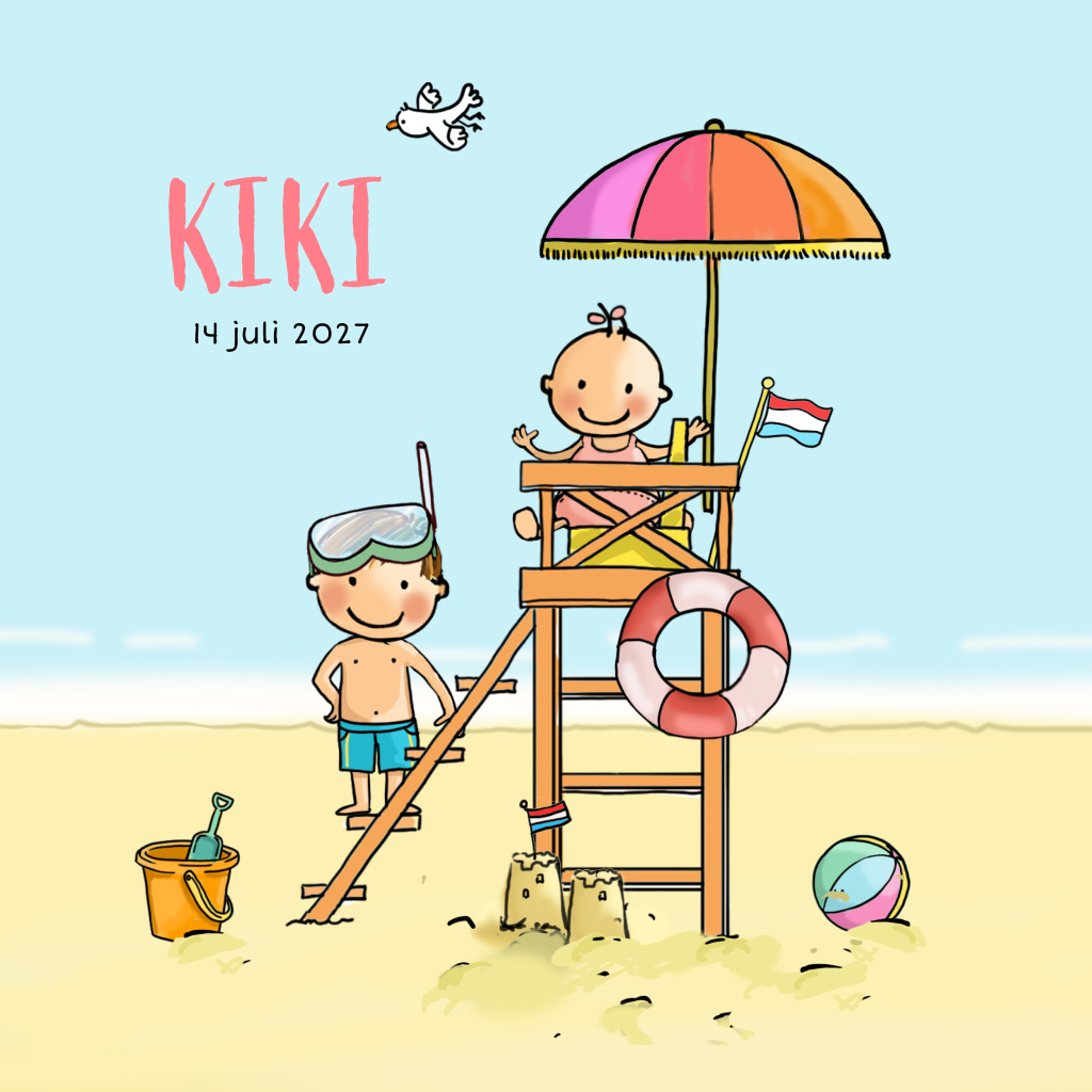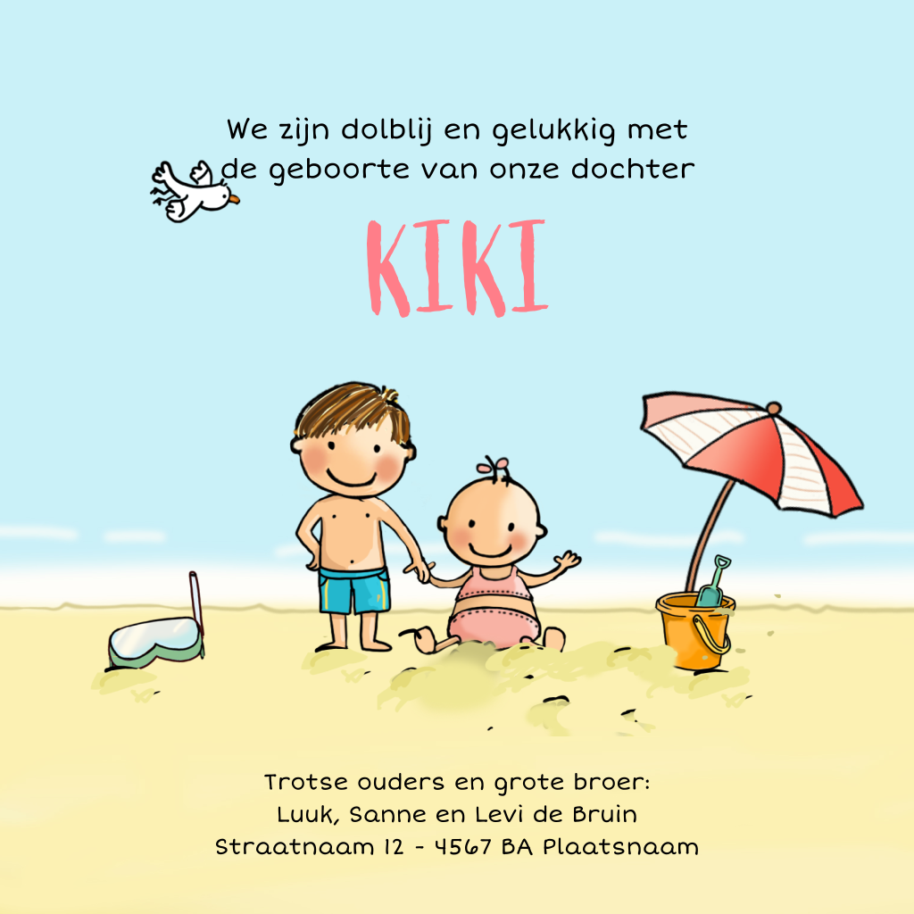 Ben je in verwachting van een 2e kindje en wordt jullie dochtertje in de zomer geboren? Kies dan dit lieve zomerse geboortekaartje met grote broer en haar baby zusje zittend op een strandwachtstoel uitkijkend over zee. Maak zelf dit zonnige geboortekaartje voor een 2e kindje.