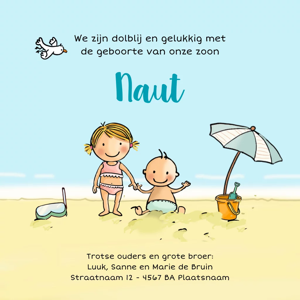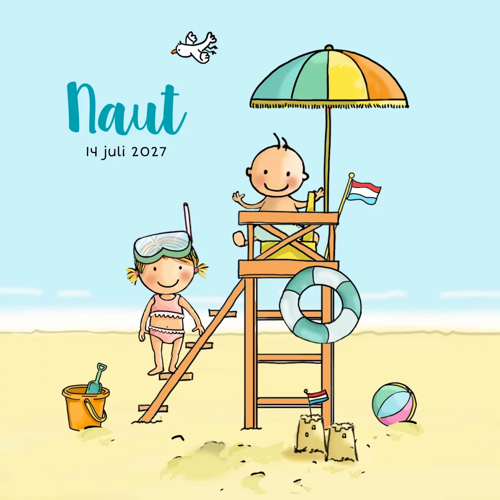 Ben je in verwachting van een 2e kindje en wordt jouw zoontje deze zomer geboren? Kies dan dit lieve zomerse geboortekaartje met grote zus en baby jongen op een uitkijkstoel op het strand uitkijkend over zee. In het zand liggen een emmer en schepje.