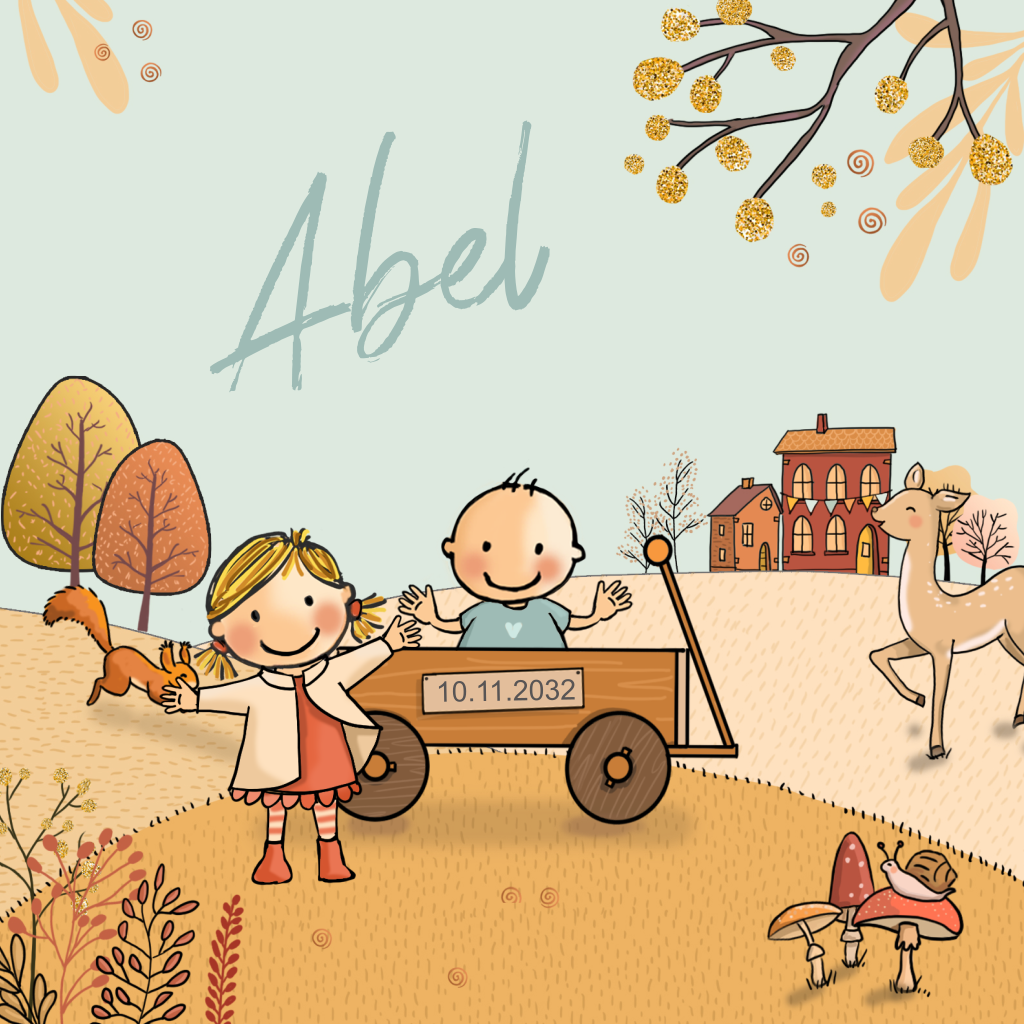 Vrolijk herfst geboortekaartje om de komst van een 2e kindje aan te kondigen bij al je vrienden en familie. Geboortekaartje met grote zus staand bij een stoere kar met daarin haar baby broertje. Op de achtergrond mooie herfstbladeren en herfstkleuren.
