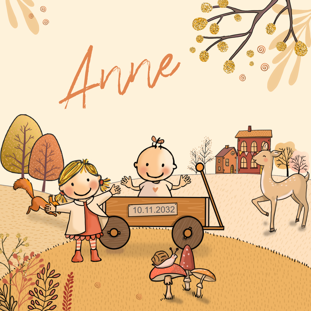 Vrolijk herfst geboortekaartje om de komst van een 2e kindje aan te kondigen bij vrienden en familie. Geboortekaartje met lief meisje staand bij een stoere kar met daarin haar baby zusje. Op de achtergrond mooie herfstbladeren en herfstkleuren.