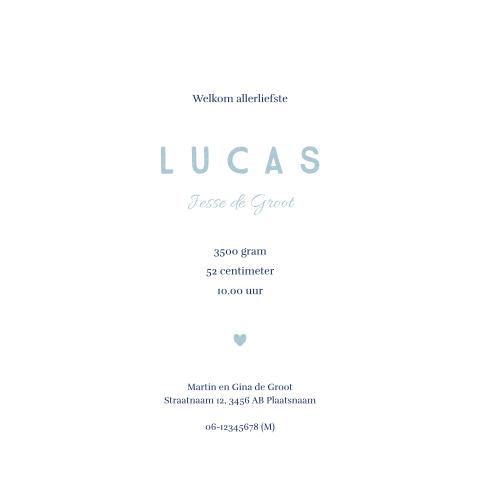 Wil je zelf aan de slag? Begin dan met een blanco kaart en kies een strak lettertype voor de naam van jullie baby. In onze ontwerptool kun je het kaartje precies naar jouw smaak opmaken. Speel met witruimte, kleuraccenten en typografie — en maak een uniek ontwerp dat helemaal bij jullie past. Bestel daarna een drukproef om zeker te zijn van het resultaat.