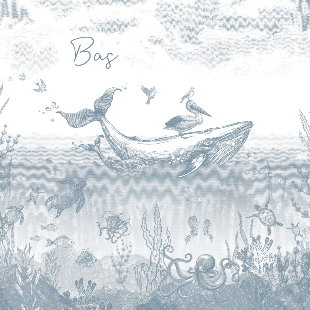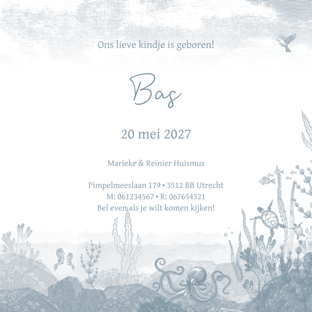 Klassieke Toile de Jouy stijl in een nieuw jasje! Het geboortekaartje geeft een kijkje onder en op het water. Verkrijgbaar in 8 prachtige kleuren.