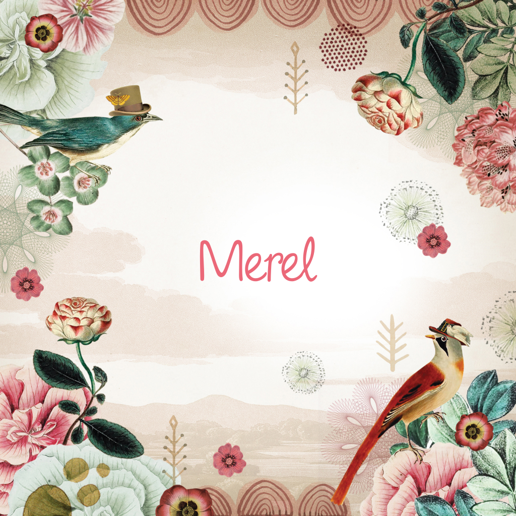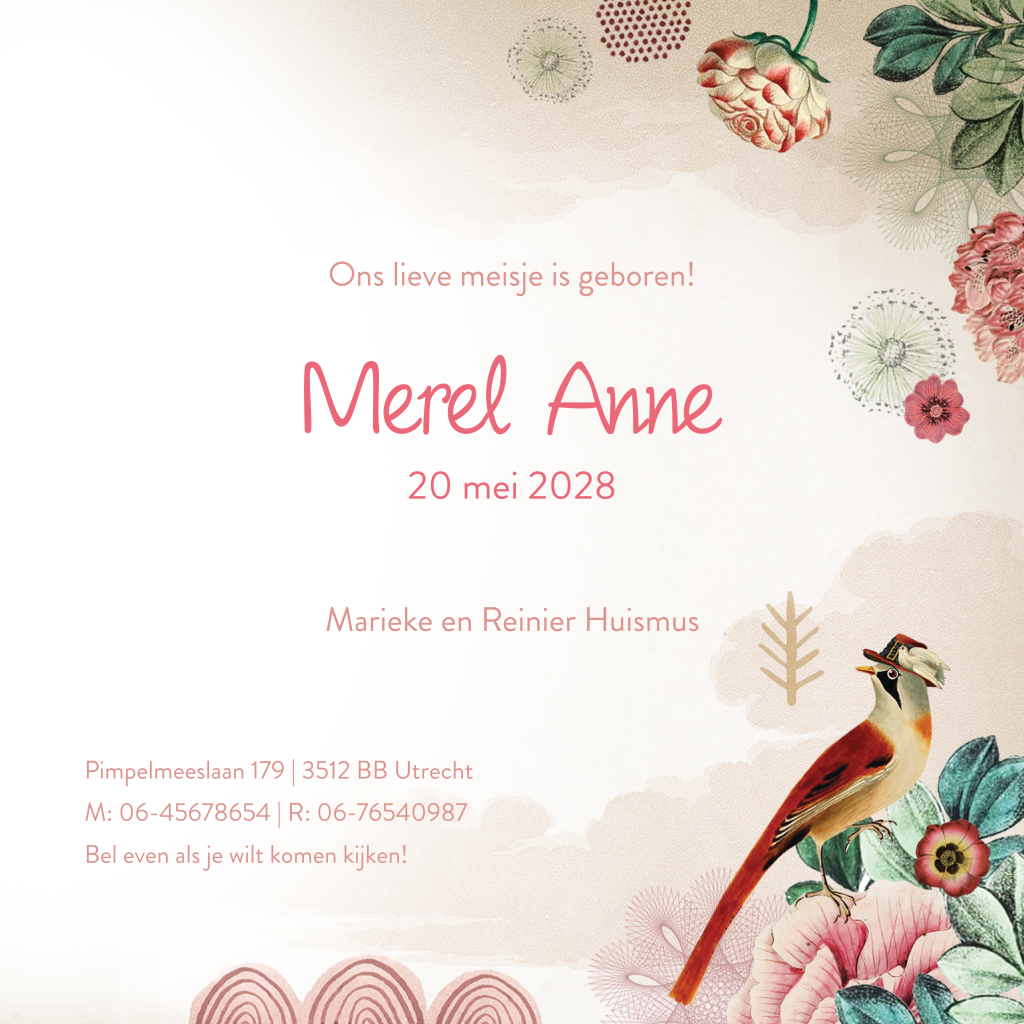 Chic geboortekaartje waarop de geboorte van jullie kindje wordt aangekondigd door deftige vogels en prachtige botanische illustraties! Handgeschilderde bloemen in waterverf, roze en zeegroene bloemen. Pas de kaart eenvoudig aan in de ontwerptool.