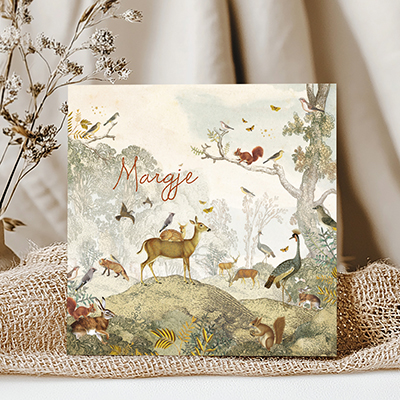 Lief geboortekaartje met hertje met baby hert op de rug op de heide. Op de achtergrond zie je heel veel verschillende dieren vrienden als een vos, pauw, konijn en eekhoorn. Pas de kaart eenvoudig aan in de ontwerptool.