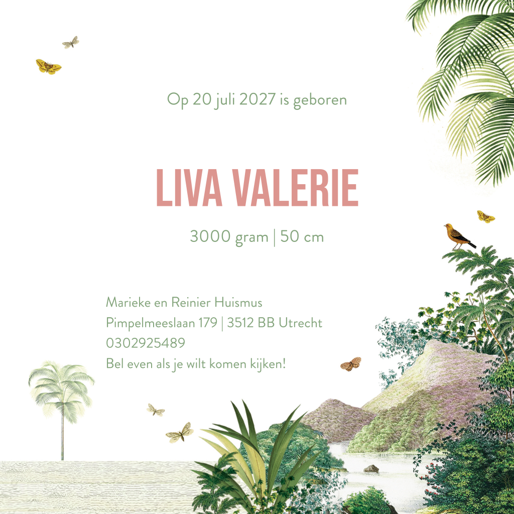 Prachtig geboortekaartje met palmbomen. Hierin verscholen lopen een luipaard en een olifant. Pas de kaart eenvoudig aan in de ontwerptool.