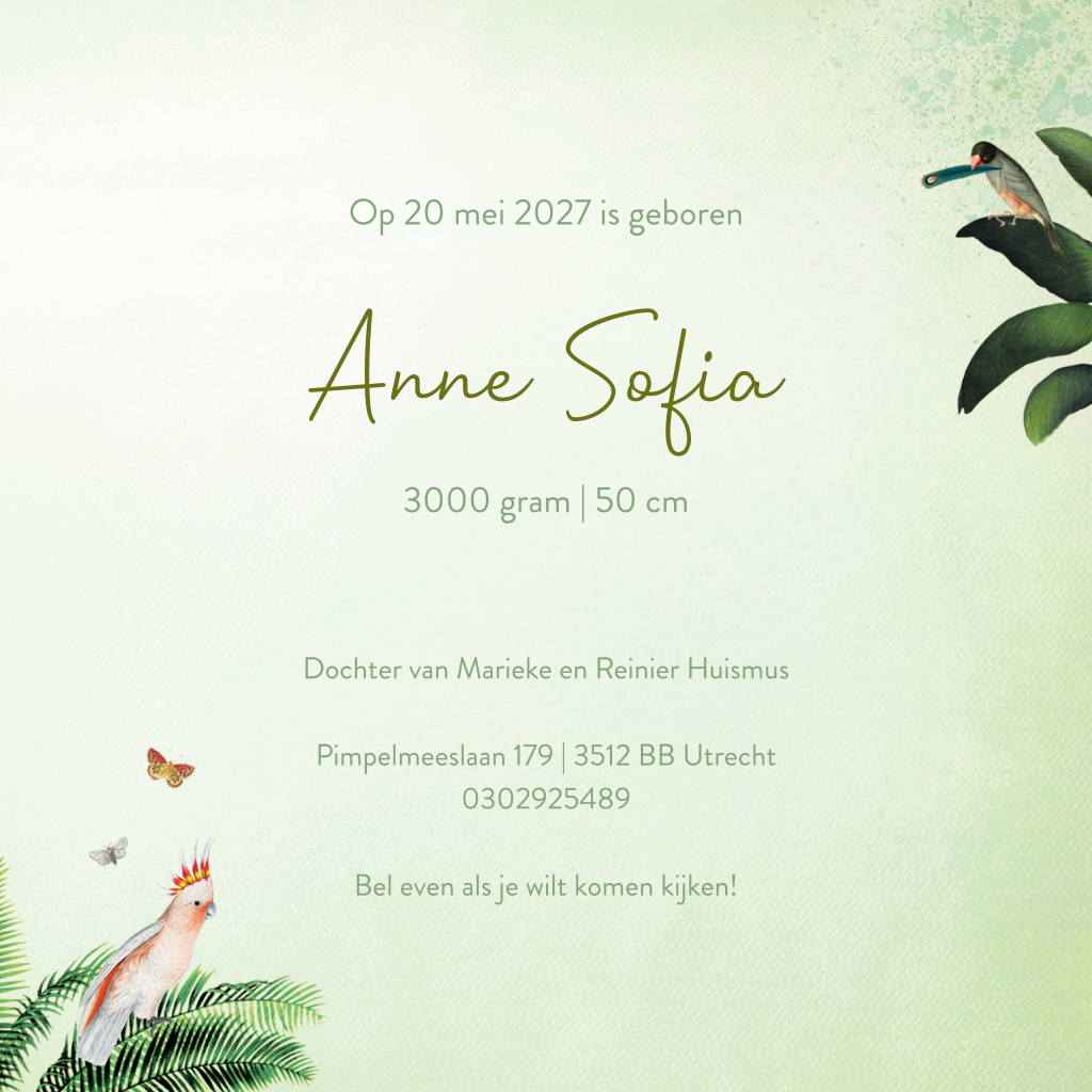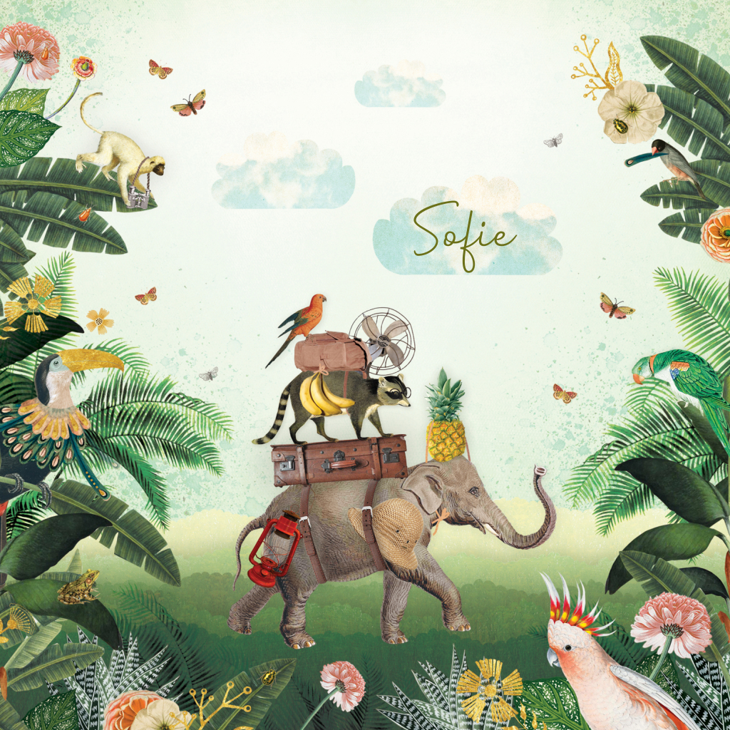 Superstoer geboortekaartje voor een meisje met coole olifant in de hoofdrol. Met koffer en das op haar rug baant hij zich een weg door de jungle. Omgeven door allerlei tropische bloemen, planten en dieren. Pas de kaart eenvoudig aan in de ontwerptool.