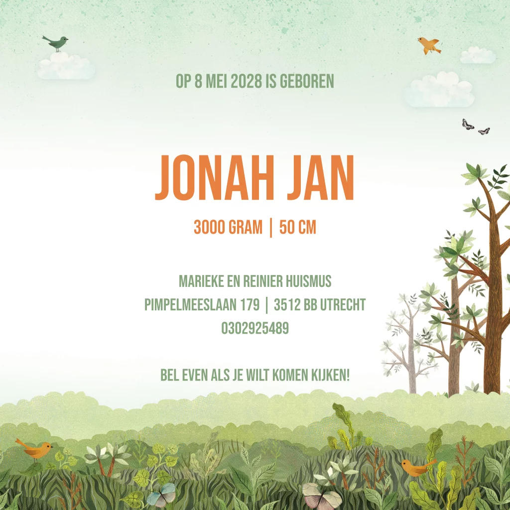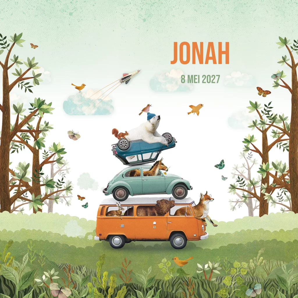 Stoer geboortekaartje met een knotsgekke toren van retro auto's. Een oranje volkswagenbus, een mintgroene kever en een blauwe mini cooper. Verstopt in de autotoren zijn een bruine beer, een vos, een ezel en een ijsbeer. Er komt ook nog een raket voorbij!