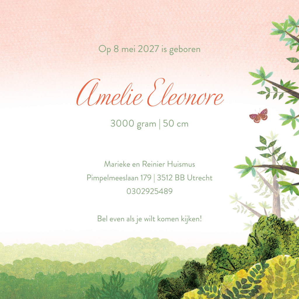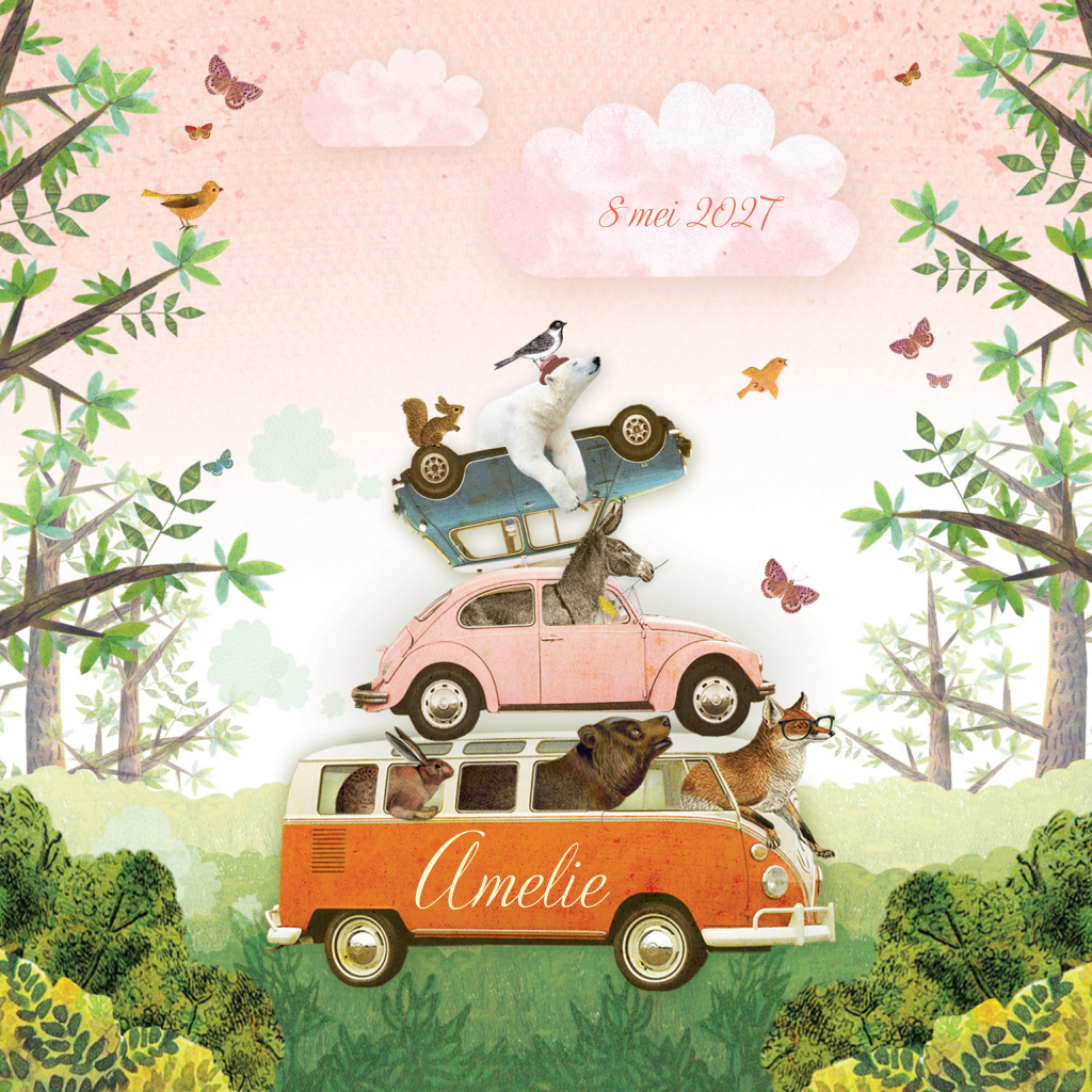 Stoer geboortekaartje met een knotsgekke toren van retro auto's. Een oranje volkswagenbus, een mintgroene kever en een blauwe mini cooper. Verstopt in de autotoren zijn een bruine beer, een vos, een ezel en een ijsbeer. Er komt ook nog een raket voorbij!