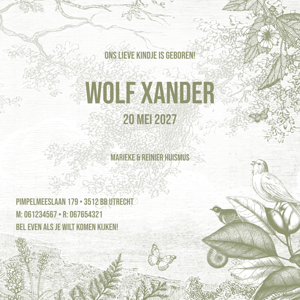 Klassieke Toile de Jouy stijl in een nieuw jasje! Het geboortekaartje geeft een mooi doorkijkje in het bos en de dieren. Verkrijgbaar in 8 prachtige kleuren.