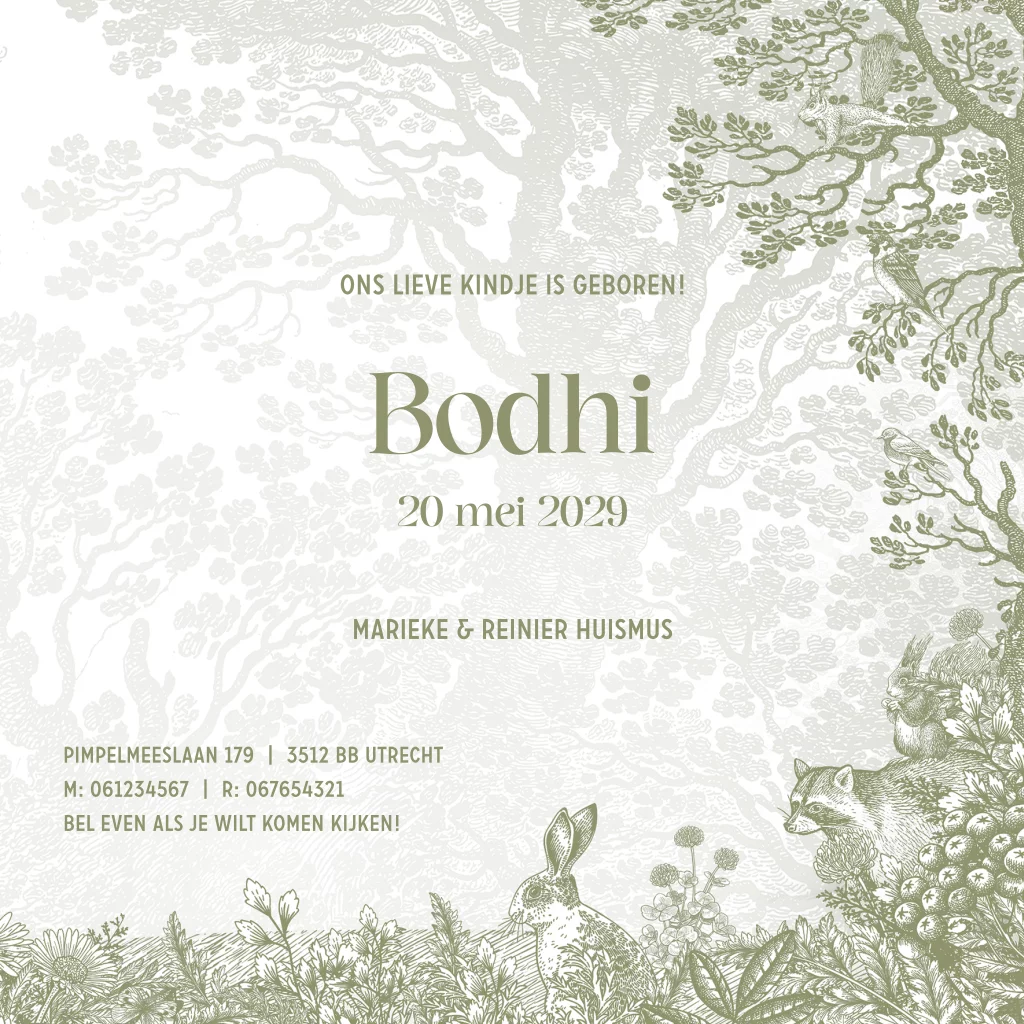 Ontdek dit geboortekaartje 'kleine beer' in groene kleur, geïnspireerd op het bos vol met dieren. Voorop de kaart een grote lieve beer en het speelse berenjong, een hert, das, uil en wasbeer kijken nieuwsgierig mee. Een prachtig en sfeervol kaartje om de geboorte van jullie kleintje aan te kondigen, met een vleugje natuur en avontuur!