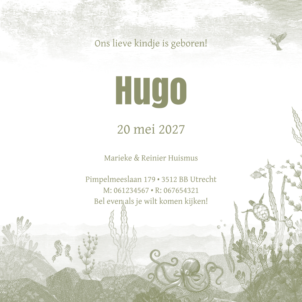 Klassieke Toile de Jouy stijl in een nieuw jasje! Het geboortekaartje geeft een kijkje onder en op het water. Verkrijgbaar in 8 prachtige kleuren.