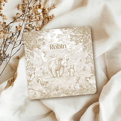 Ontdek dit geboortekaartje 'kleine beer' in mosterdgele kleur, geïnspireerd op het bos vol met dieren. Voorop de kaart een grote lieve beer en het speelse berenjong, een hert, das, uil en wasbeer kijken nieuwsgierig mee. Een prachtig en sfeervol kaartje om de geboorte van jullie kleintje aan te kondigen, met een vleugje natuur en avontuur!