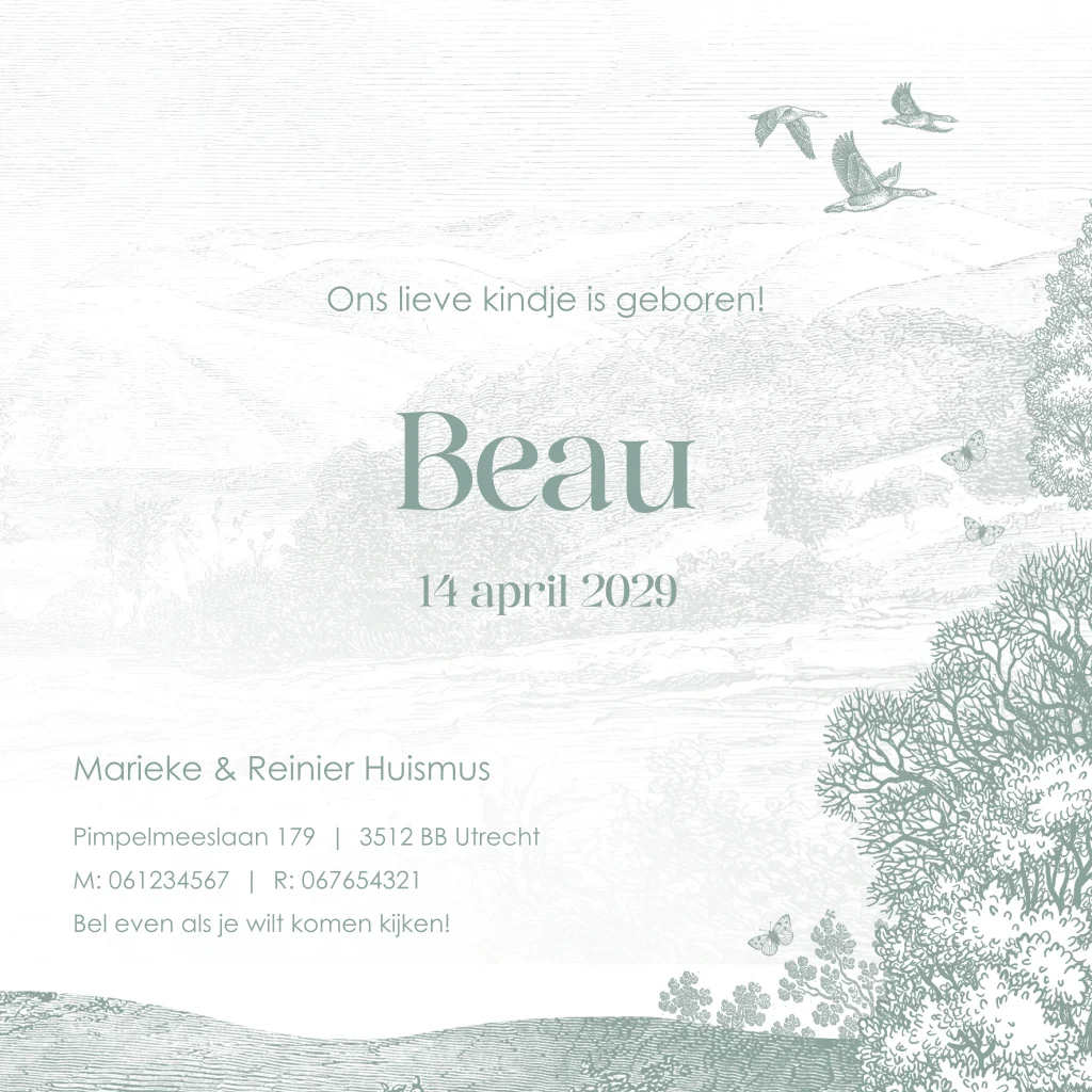 Dit geboortekaartje van Pimpelmees in zeegroen heeft een frisse en eigentijdse uitstraling. De klassieke boerderijdieren komen prachtig naar voren in deze kleur en geven het kaartje een unieke charme. Een stijlvolle keuze voor wie een bijzonder geboortekaartje zoekt met een vleugje originaliteit.
