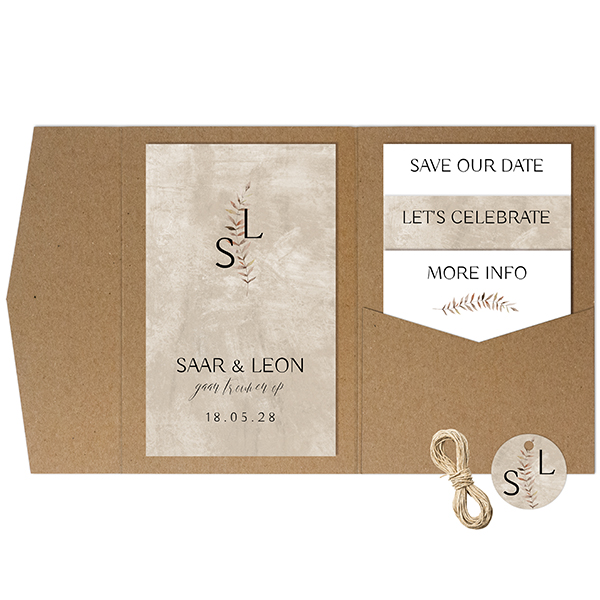 De linkerzijde van het pocketfold-mapje biedt een mooie plek om de beige kaart met jullie initialen te plaatsen. Aan de rechterzijde kun je meerdere kaartjes toevoegen met essentiële informatie, zoals de locatie, namen van de ceremoniemeester, cadeauwensen en de dresscode.