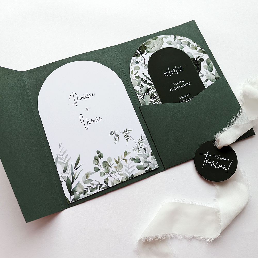 Op zoek naar een unieke en botanische trouwuitnodiging? Ga voor deze set kaarten die je in een pocketfold mapje kunt plaatsen. De kaarten worden versierd door een prachtig patroon van waterverf bladeren. Plak de halfronde kaart met jullie namen in sierlijke letters aan de ene kant in het mapje en plaats de kaart vol groene bladeren en het smalle kaartje in de insteekhoes aan de andere kant. Op het smalle, donkergroene kaartje is ruimte voor jullie dagprogramma.