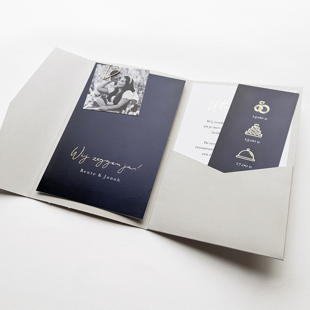 Donkerblauwe pocketfold trouwkaart met goudfolie en eigen foto