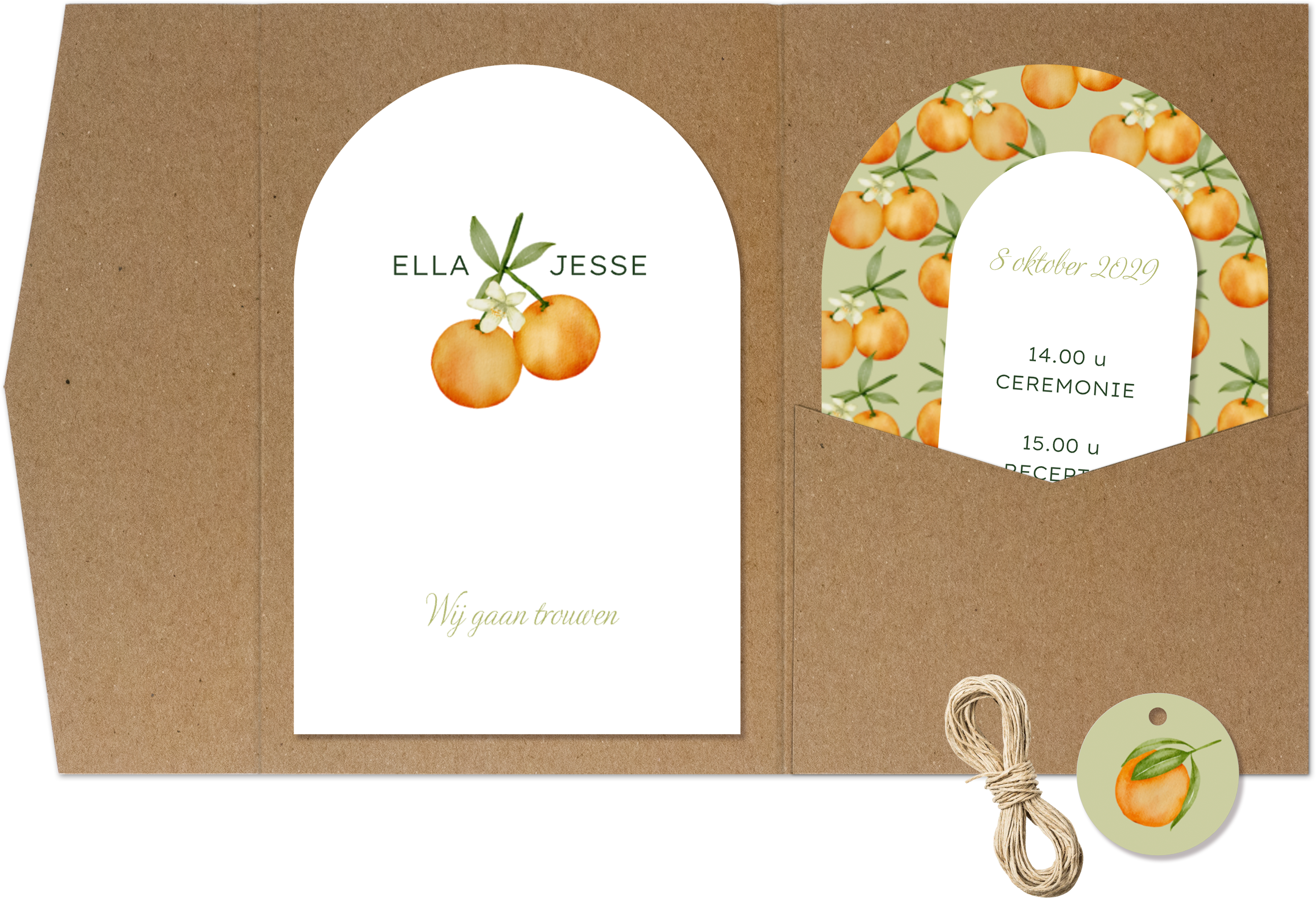 Deze prachtige set kaarten past perfect in een rechthoekig pocketfold mapje. De kaart met jullie namen en takje met sinaasappels kun je in het mapje aan de linkerzijde plakken, de kaart met het patroon van sinaasappels en het smalle kaartje met dagprogramma kun je in het mapje aan de rechterzijde steken.
