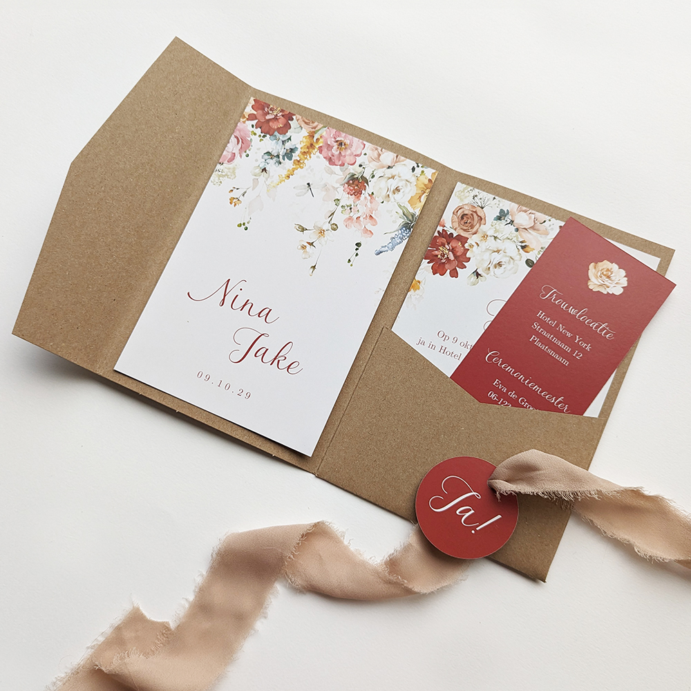 Prachtige en bijzondere trouwuitnodiging met waterverf bloemen en sierlijke letters. Deze kaartenset is geschikt voor een rechthoekig pocketfold mapje. Het kleine vierkante kaartje met eigen foto kun je met een paperclipje vastmaken aan de kaarten of aan het mapje. Zo krijg je uiteindelijk een unieke uitnodiging met een persoonlijk tintje. Pas dit ontwerp naar eigen wens aan in onze handige editor.