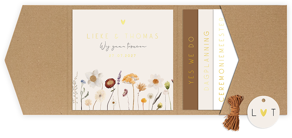 Pocketfold trouwkaart met bloemen. Rechts in de pocket een stapeltje van kaartjes met alle informatie over jullie dag erop. De hele set kun je helemaal naar wens aanpassen.
